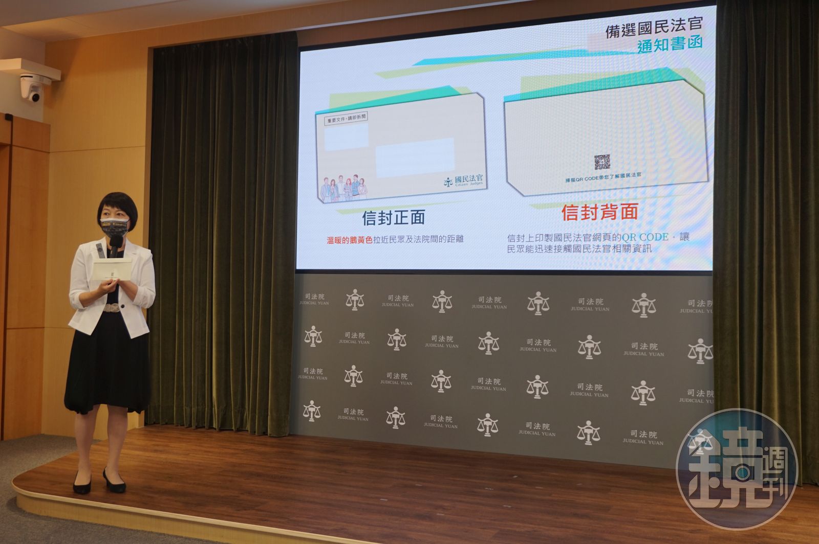 彭幸鳴表示,國民法官新制跳脫過往公務機關制式書函格式,用合乎直覺、美觀具親和力的排版,簡單易懂的文字,設計出信封、簡介、調查表、申請書等相關文件,讓民眾更容易理解國民法官制度內涵,進而願意參與審判。