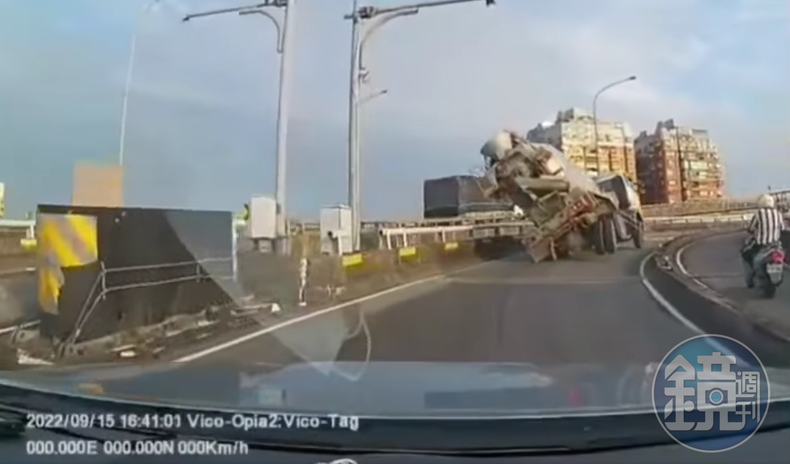 一名網友在臉書社團「爆料公社」分享一段17秒鐘的行車記錄器影片,畫面顯示事發在15日下午4點41分左右,駕駛前方有一台水泥車,右前方機車道有2輛機車,水泥車卻在右轉時疑似未抓好距離,右後輪直接上了分隔島,導致車體整個往左傾斜約45度。