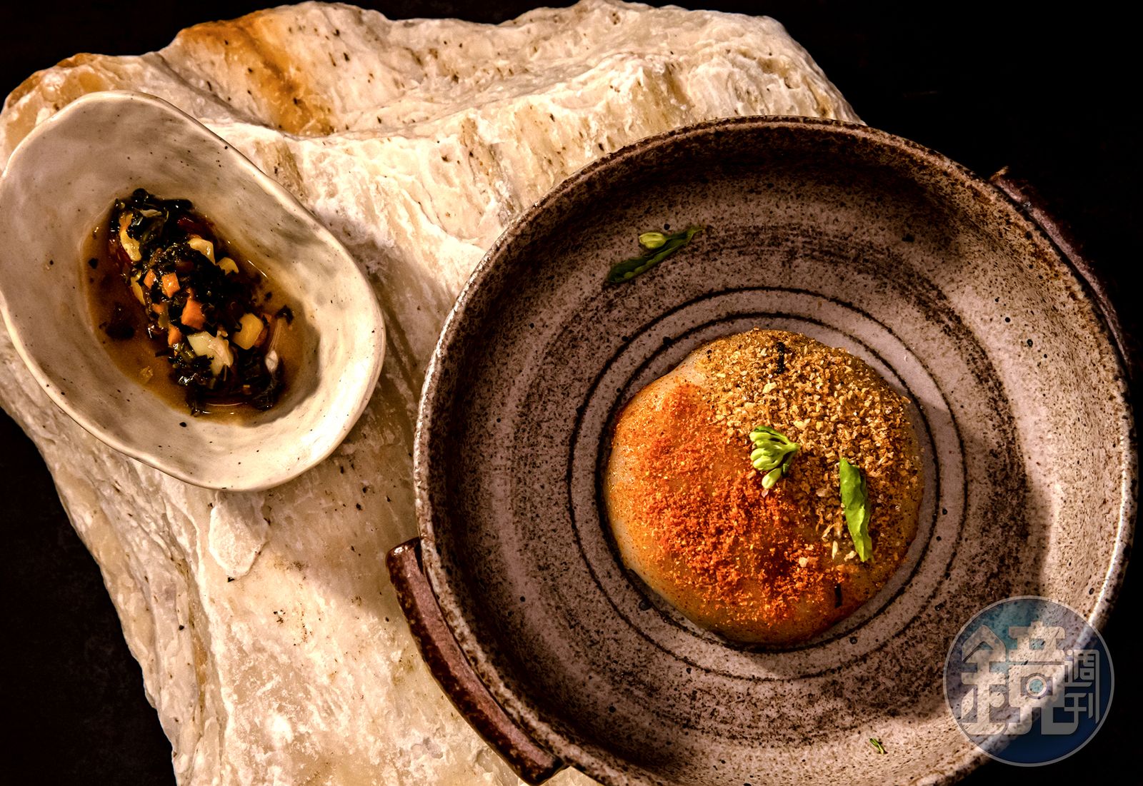 由於Tim友人的先生對乳製品過敏,他設計的新菜單全無乳製品,以堅果類與豆製品取代,或由發酵食材調製風味,好比「櫛瓜和大量蔬菜要來了」烤櫛瓜淋上鹹豆漿,表現溫潤的冬日卡加利;Tim也在異國重新詮釋台灣小吃,「她從台中來,當然要有鹹味的韭菜盒子」把糯米做的口袋餅,塞進炒豆腐、粉絲、菠菜與韭菜,軟糯鹹香,上菜時廚師還會端出味噌辣醬、辣椒甜醬、極辣醬3款醬料,讓你自選一款,增添互動趣味。