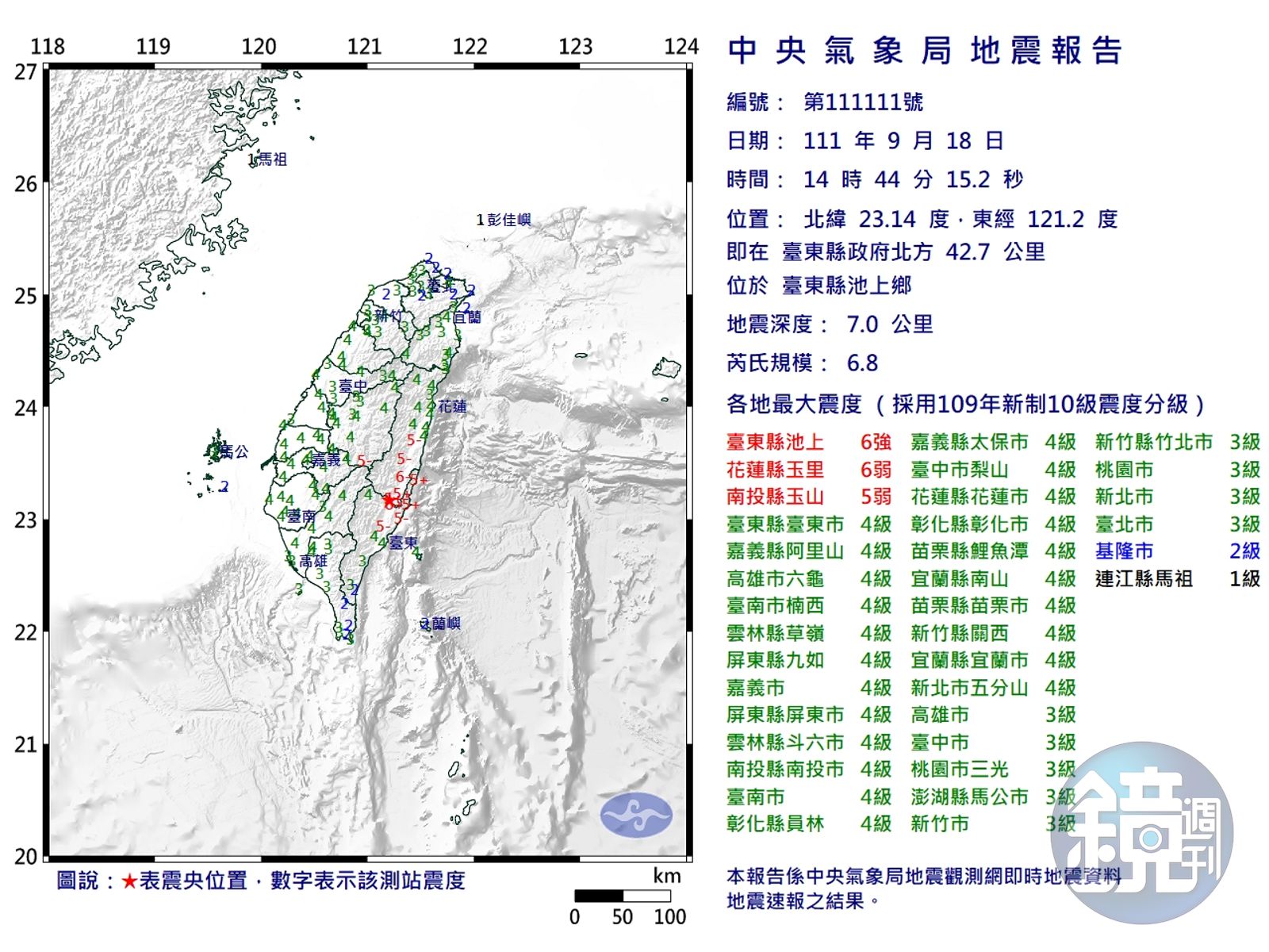 中央氣象局說明,今下午14時44分發生規模6.8地震,震央位於台東縣池上, 地震深度7公里,各級震度為台東6強+、花蓮6弱、南投5弱、嘉義、高雄、台南、雲林、屏東、台中、彰化、苗栗、宜蘭、新竹、新北皆為4級,桃園、新竹、台北、澎湖、基隆、連江為3級。