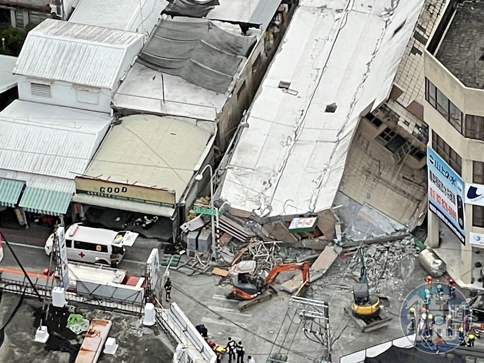 畫面顯示,該排樓房朝馬路的方向傾倒,傳出有4人受困,警消獲報後也立刻出動搶救,其他縣市也派出救難隊伍前往當地馳援。