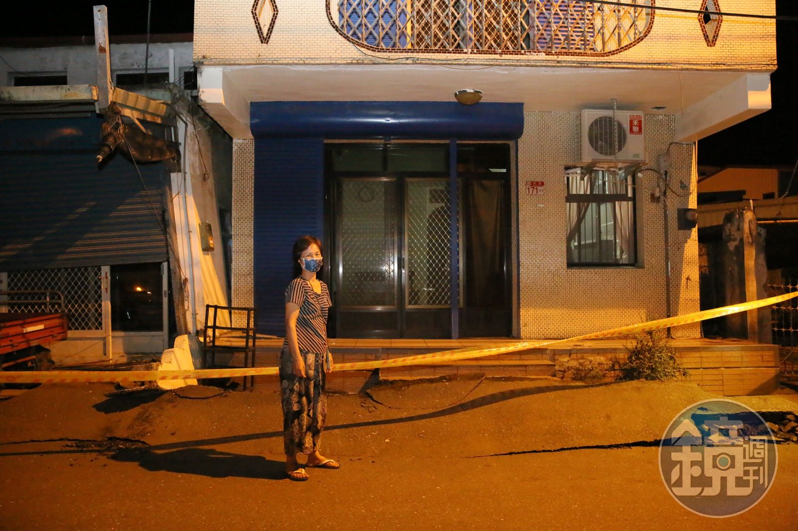 家園成了危樓,被拉起封鎖線以防意外發生,婦人無助地站在自家門前,有家歸不得。(翁睿坤攝)