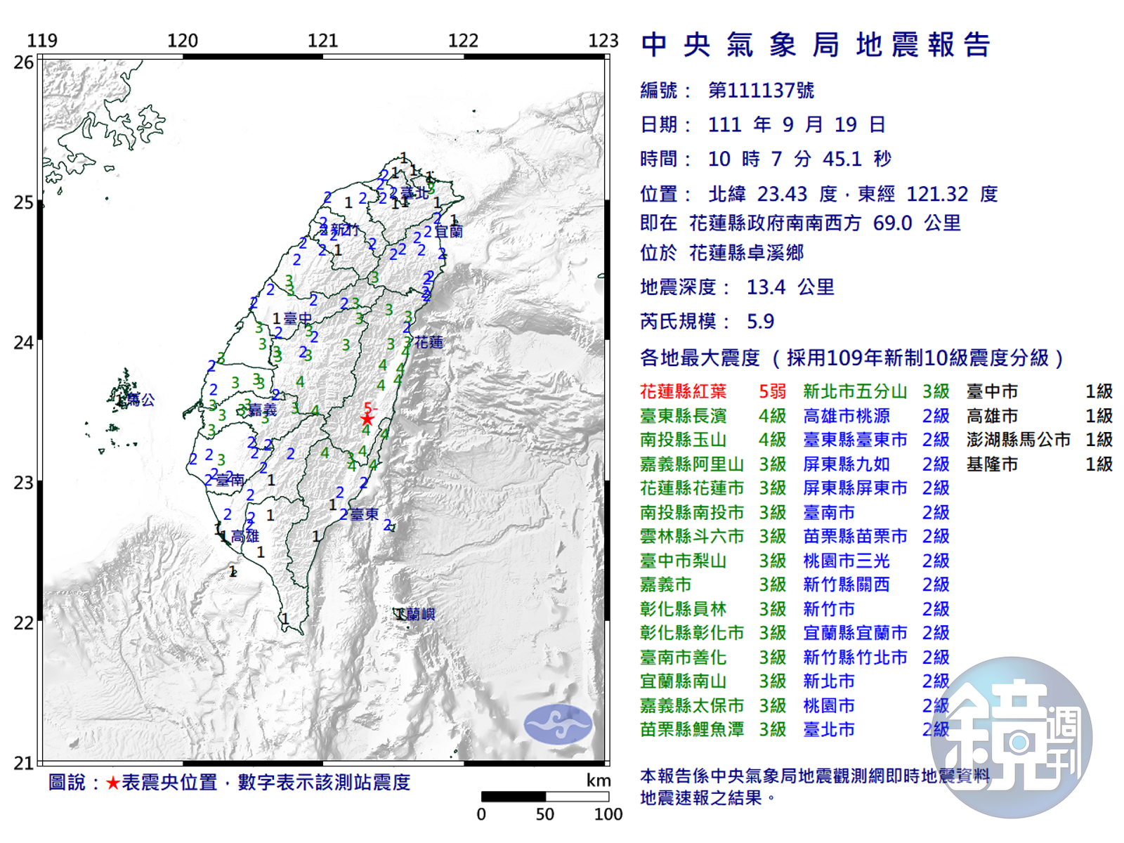 氣象局發布初步報告,今日上午10點07分在花蓮縣卓溪鄉發生規模5.9地震,深度13.4公里。最大震度分別為花蓮5弱;台東、南投4級;嘉義縣市、雲林、台中、彰化、台南、宜蘭、苗栗、新北等地為3級;桃園、新竹縣市、台北2級;澎湖及基隆1級。