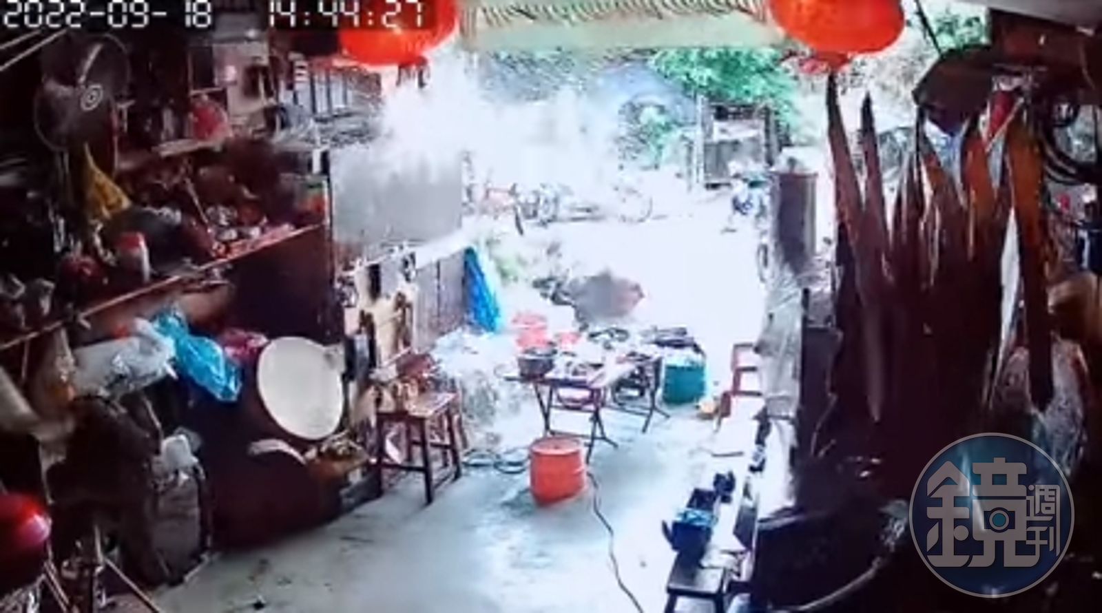接著,畫面右下角出現原先在屋內的3人,也匆忙逃命,強震使水缸內的水灑到路面,導致後面2人慘摔在地,接著爬起來繼續逃到室外,畫面相當怵目驚心。