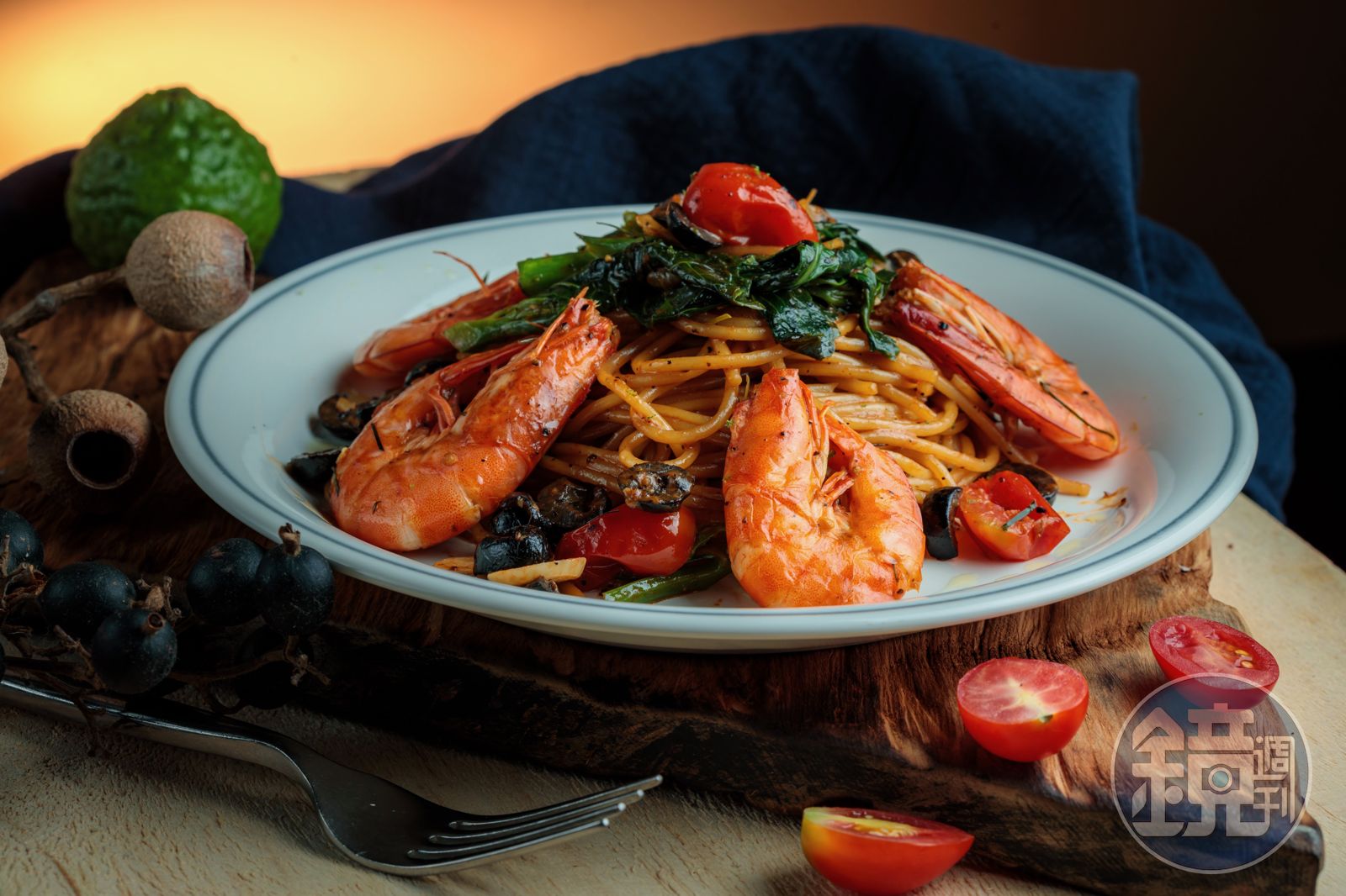 泰式口味「蝦 油菜花 檸檬葉」,用魚露、檸檬葉提出海鮮香氣,泰國檸檬皮畫龍點睛,為維持新鮮白蝦口感,刻意不剝殼清炒,但會貼心提供刀叉讓不想沾手的客人使用,不怕手染蝦味的我,剝開蝦殼,蝦肉送進嘴裡的彈性,契合乾燥義大利直麵炒出的彈牙麵心。「雞肉 羽衣甘藍」將煎炒後的雞腿肉倒入雞高湯清炒,羽衣甘藍以黑橄欖、酸豆平衡苦味,怕苦的人不必擔心點這盤會自找苦吃,不過我就愛它的苦,願意把黑橄欖的扣打讓給別人。