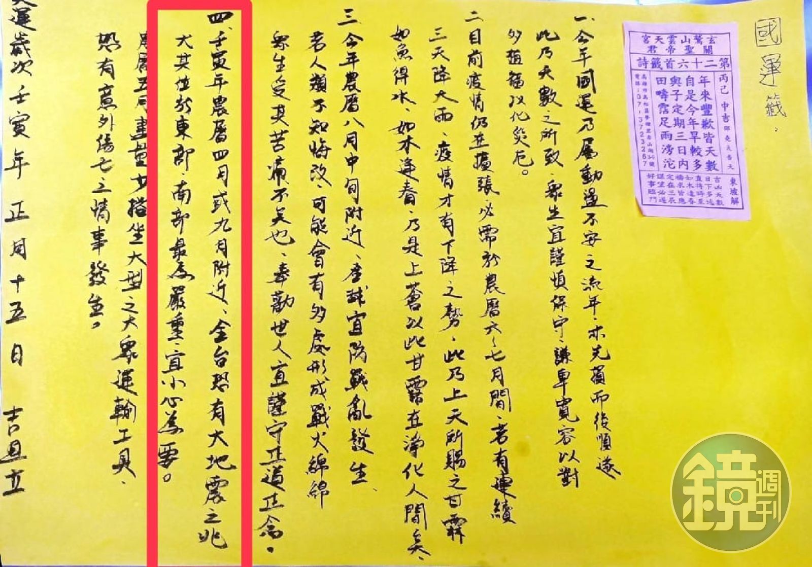 一名網友日前在臉書社團「高雄大小事」表示,「年初國運籤帝君已示警,祈求大家平安」,並分享今年初鳥松玄鹫山高邑雲天宮抽出的國運籤圖片,上頭寫著「壬寅年農曆4月或9月附近,全台恐有大地震,尤其位於東部、南部最為嚴重,宜小心為要。」