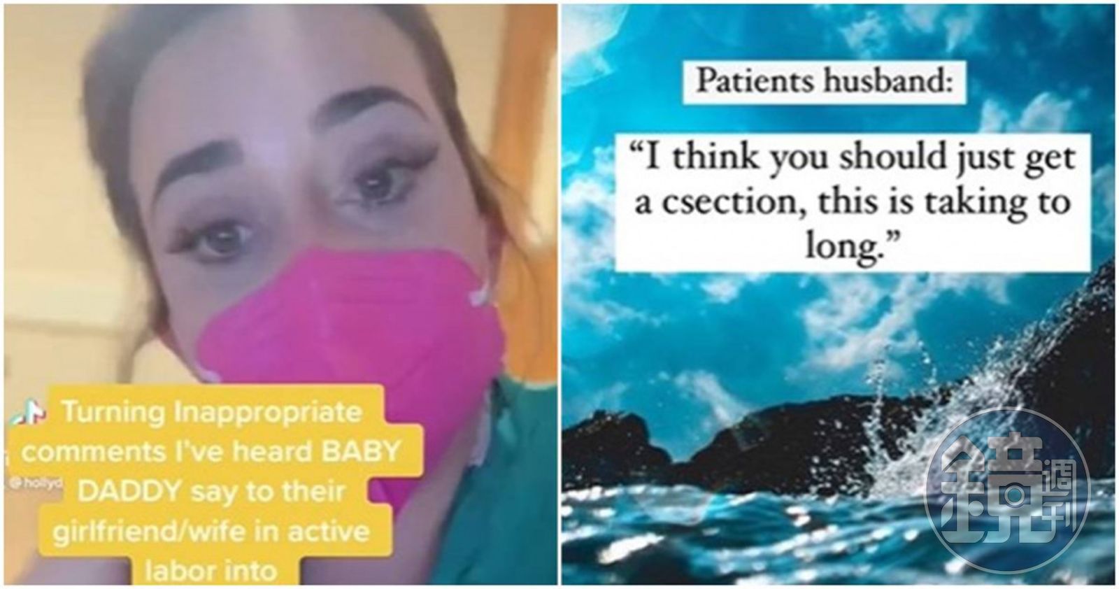 根據《紐約郵報》報導,一名在產房的護士霍莉(Hollyd)在抖音上分享一段在產房影片,透露不少爸爸都會在產房跟孕婦說,「你確定要硬膜外麻醉嗎?我媽沒有做。你在做出決定以前,我們應該討論一下」「我認為你要做剖腹產,因為時間花太久了」「醫師請在那再幫我多縫一針,我們希望跟之前一樣」,甚至還有人問過,整個分娩過程還要多長,因為這週末他還有別的規劃。