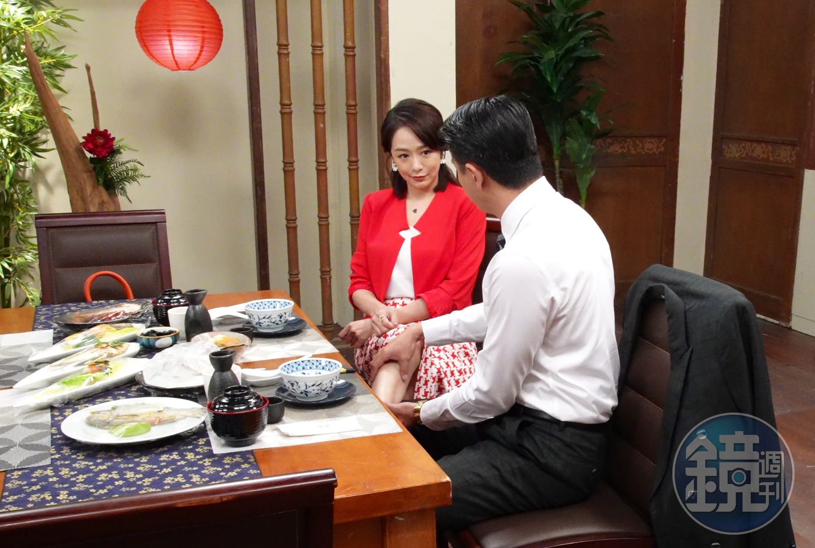 茵芙拍攝前仔細的打量整桌豐富的料理,開玩笑說:「如果不打斷你按摩,我是不是就可以一直吃龍蝦?」,唐豐則是笑回:「那我應該就會問妳怎麼都只有自己在吃?」茵芙拍攝約會戲不斷嶄露甜美笑容,不僅是因為有滿桌最愛的日式料理,茵芙更認為劇中角色「淑瑛」,一直以來都是為了生活才和其他男人在一起,這次遇上唐豐飾演的「許中信」,才真正談了第一次戀愛,而唐豐劇中雖然是有婦之夫,但夫妻感情漸行漸遠,和茵芙接觸後再度點燃戀愛的感覺,因此很投入在追愛。兩人外型登對,劇中即使皆是婚內出軌,但由於畫面好看,也有網友稱讚:「根本中年版偶像劇。」