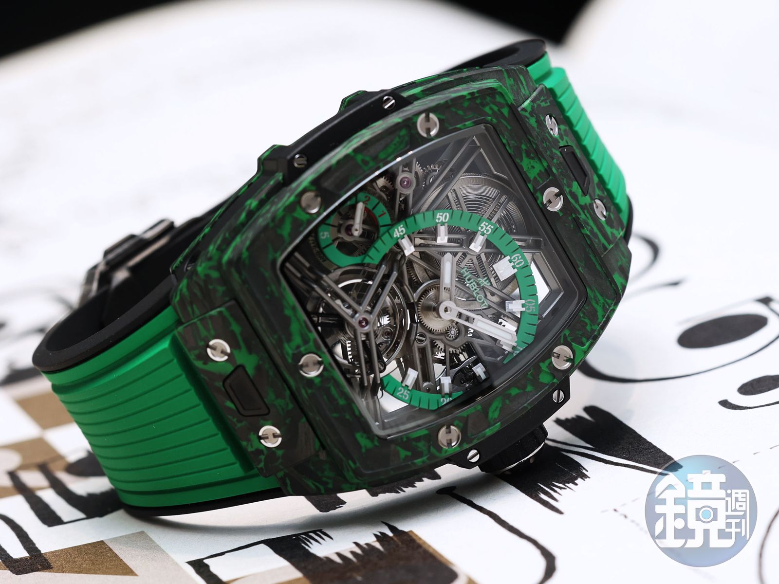 這次最新的Spirit of Big Bang羅勒綠陀飛輪碳纖維腕錶,是這個款式的新色版本。Spirit of Big Bang系列最早於2014年登場,是旗下第一個酒桶殼型的系列,除了錶殼線條之外,錶圈的螺絲以及多層次錶殼結構也都承襲自宇舶錶的設計特色;2019年,宇舶錶在此系列率先使用碳纖維材質,並且提供黑色與藍色兩種版本,這次則是延伸出羅勒綠的樣式。就這樣的脈絡來看,宇舶錶在碳纖維上的操作就跟它在陶瓷與藍寶石水晶材質上一樣,多數的顏色都能駕馭了,未來就是看如何去變化顏色與材質間的組合方程式了。