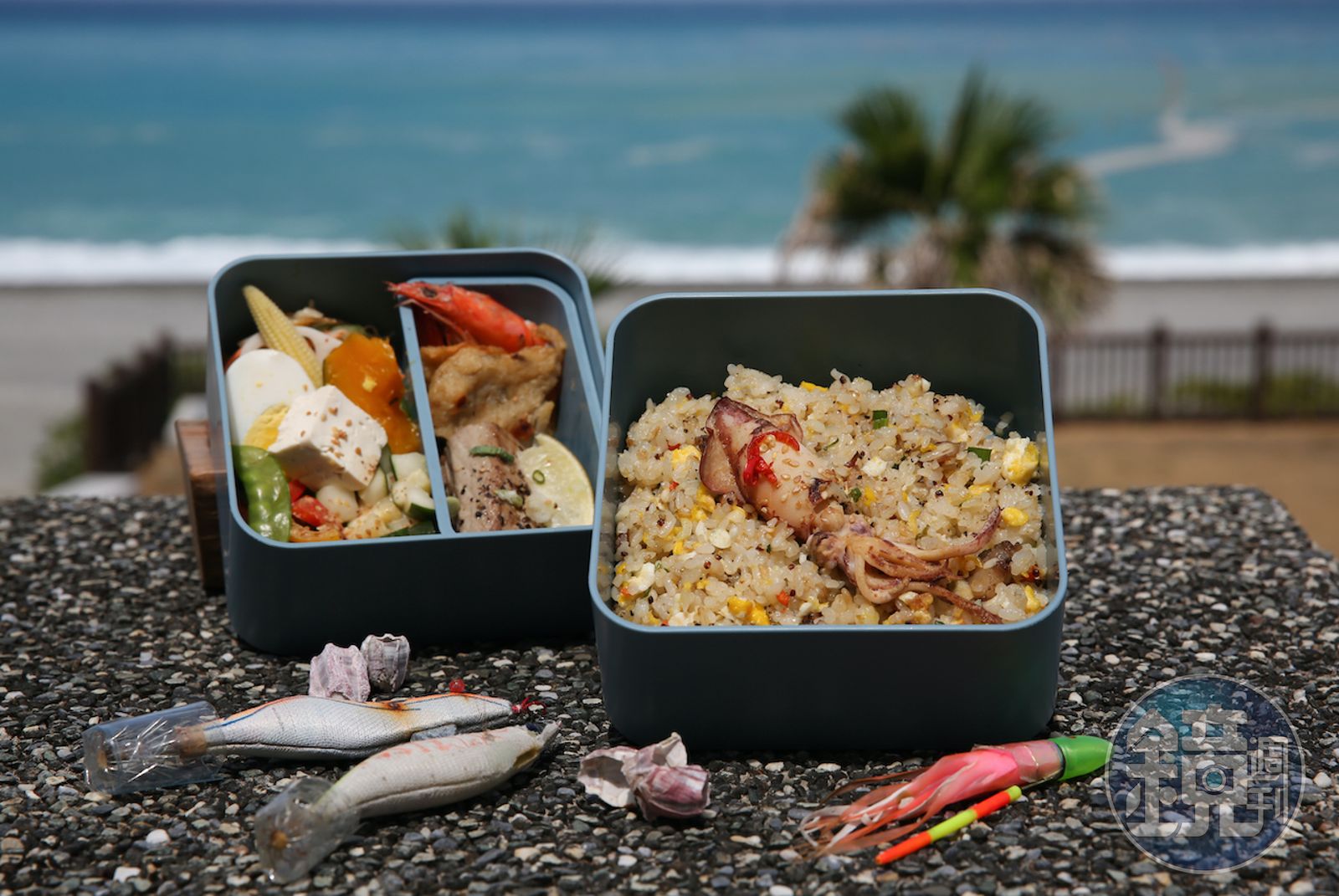 洄遊吧也跟在地文創餐廳「黑金通」聯手推出「洄遊吧特製望海野餐便當」,菜色包括小管炒飯,配炸鬼頭刀和烤蔬菜。只要先預約,來領了就可以走到海邊野餐,之後再回來還餐盒,是一個訴求環保的海鮮餐盒設計。