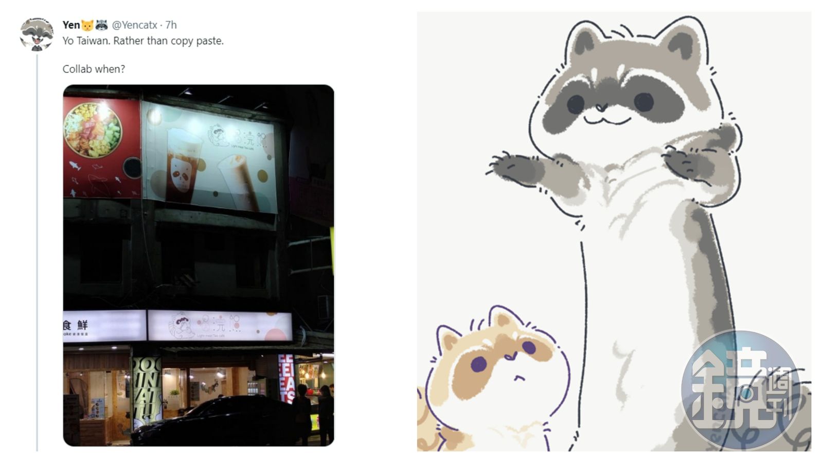一名擁有超過10萬人追蹤的外國浣熊插畫家「Yen」,今(28日)上午9時許在推特貼出一張「喝浣熊茶屋」手搖飲街頭照片,直言「Yo Taiwan,比起複製貼上,什麼時候合作了?」並在留言處稱「嚴格來說,我很高興各地人們,碰巧路過並認可我的作品」,最後用簡體字寫下「謝謝你們」。