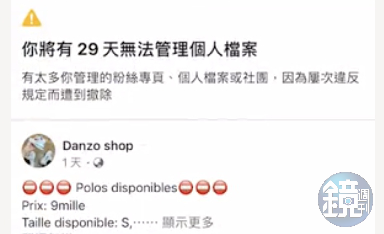 誇張的是,楊收檢舉信不到半天的時間,粉專無預警遭到刪除,讓他感到錯愕。楊表示他創立的精品店粉專在本月11日遭到偽官方帳號標記,起初不以為意,但沒想到17日凌晨,楊就收到臉書違規通知,且違規貼文竟超過10筆,但違規貼文僅一篇來自楊的粉專,其餘貼文皆來自於假粉專。