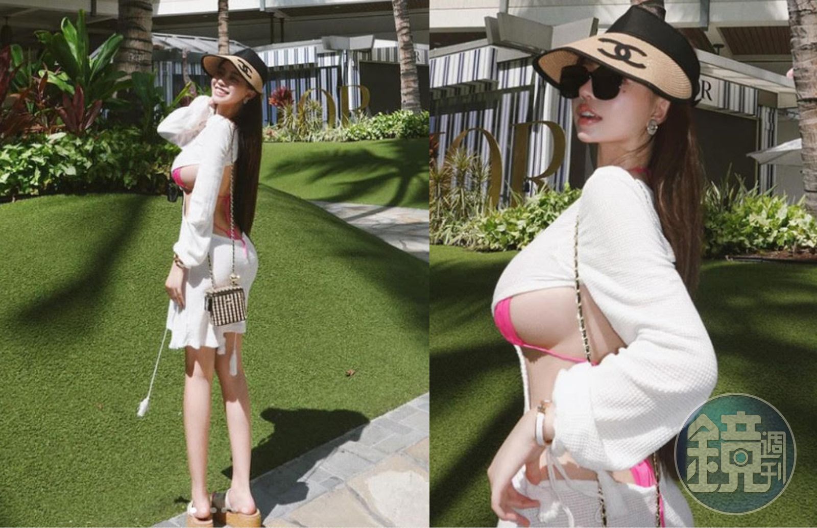 美照中的她身穿紅色比基尼,外罩白色挖空罩衫,腳蹬草編厚底楔型鞋,一襲熱帶渡假風格搭配有香奈兒LOGO的遮陽帽。其中一張轉身側面照,更是遮不住車頭燈,亮得粉絲覺得眼睛快睜不開。辣照吸引大批粉絲朝聖留言,盛讚她:「太美」「這套太犯規了,阿嘶」「這根本就是戰鬥服」。