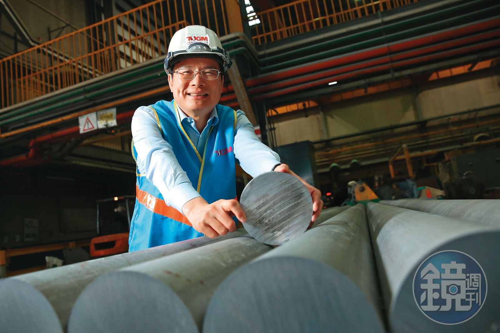 上午7點,廷鑫興業董事長顏德新從台中住家驅車前往台南廠,抵達後習慣先巡一輪。9千坪廠區裡,高溫逾千度的熔煉爐能讓鋁料變成銀色鋁湯,流過澆鑄模桌,製成不同粗細的鋁棒,「鋁材重量輕、強度卻可達建築用的中碳鋼等級,價格更有競爭力,IKEA家具之所以能走平價路線,就是因鋁只要三分之一的材料量就能取代鐵,現在鋁材在電動汽車、高階腳踏車應用端也越來越廣。」