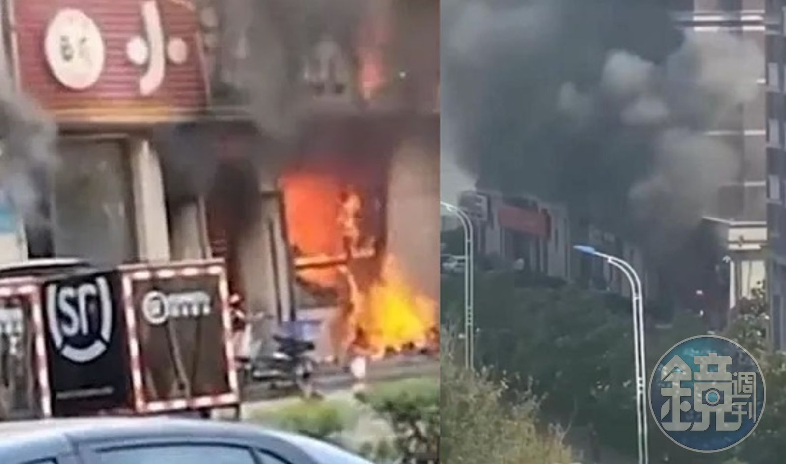 現場竄出黑煙,餐廳內的惡火不斷燃燒。(翻攝自微博)綜合中國媒體報導,28日中午12時40分許,吉林省長春市高新區一家餐廳突發生爆炸燃燒事故,消防人員獲報後立即趕往現場,共出動13輛消防車輛、60名人力展開救援,也馬上成立現場指揮部,協助救援工作。