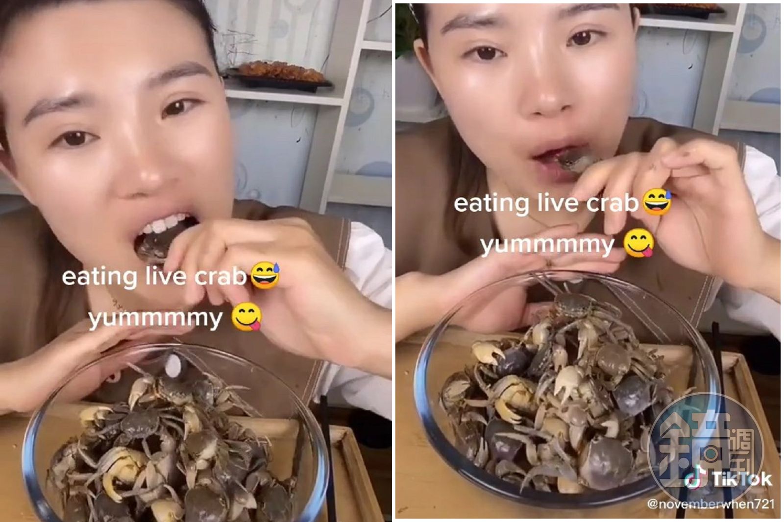 這段TikTok影片可見,該名女子大吃整碗活螃蟹,只見螃蟹的螯足仍在動,但女子完全不怕被咬的風險,直接把活螃蟹一口咬下去嚼,還吃得津津有味。