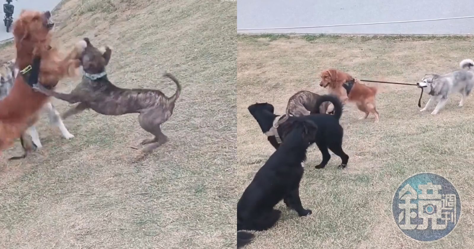 微博帳號「吐槽大亨」近日上傳一隻40秒的影片,畫面中有多隻戴著項圈的寵物狗在一處草地上,其中一隻雜色米克斯對著身上有牽繩的黃金獵犬齜牙裂嘴,不停吠叫挑釁,後方的阿拉斯加犬見狀,趕緊咬著黃金獵犬的牽繩試圖將牠拉離現場,黃金獵犬雖然後退了幾步,但眼睛直盯著挑釁的米克斯。