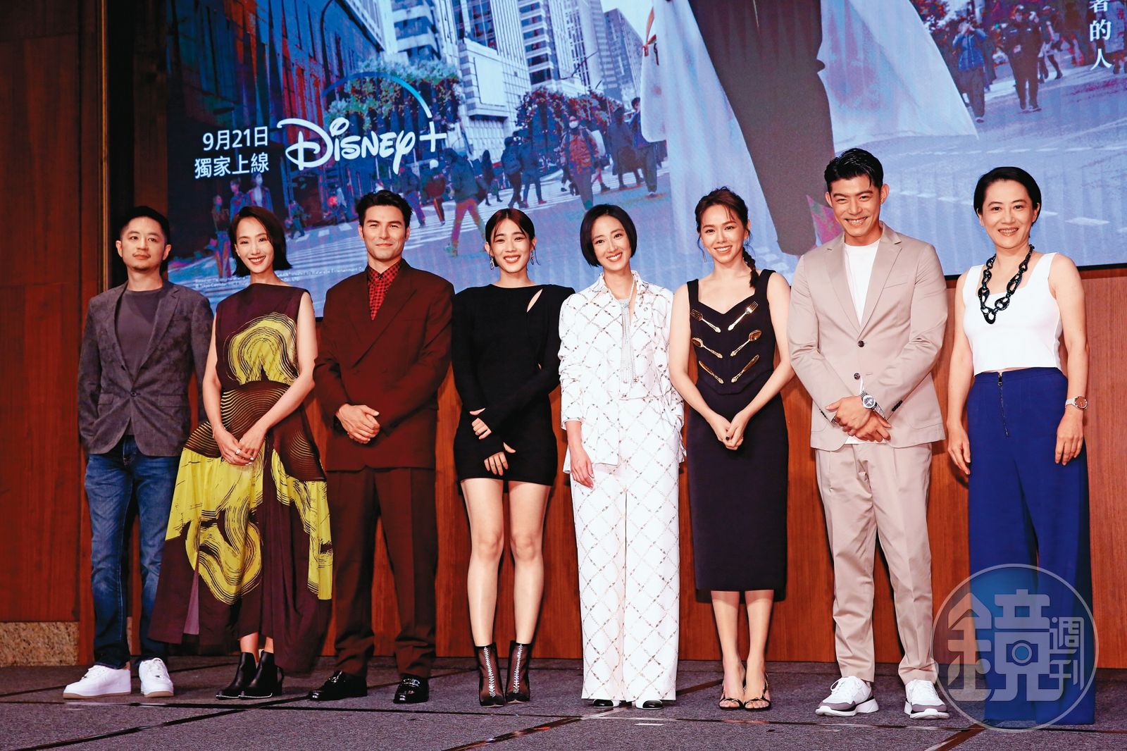 格帝集團執行長賴宇同(左起)率演員陸明君、鳳小岳、林思宇、桂綸鎂、夏于喬、王柏傑及導演李芸嬋,出席新戲上線記者會。發布時間:2022.10.04 05:58 臺北時間