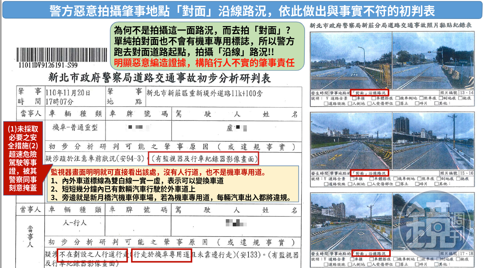 A先生表示,根據新北市交通大隊所製作的初判表來看,上面列示行人「疑涉不在劃設之人行道行走(行走於機車專用道且未靠邊行走)」。但根據現場情況及事故畫面影像,該處根本沒有人行道,也非機車專用道,他質疑警方刻意營造行人占用機車專屬路權,形成錯誤假象意圖卸責。