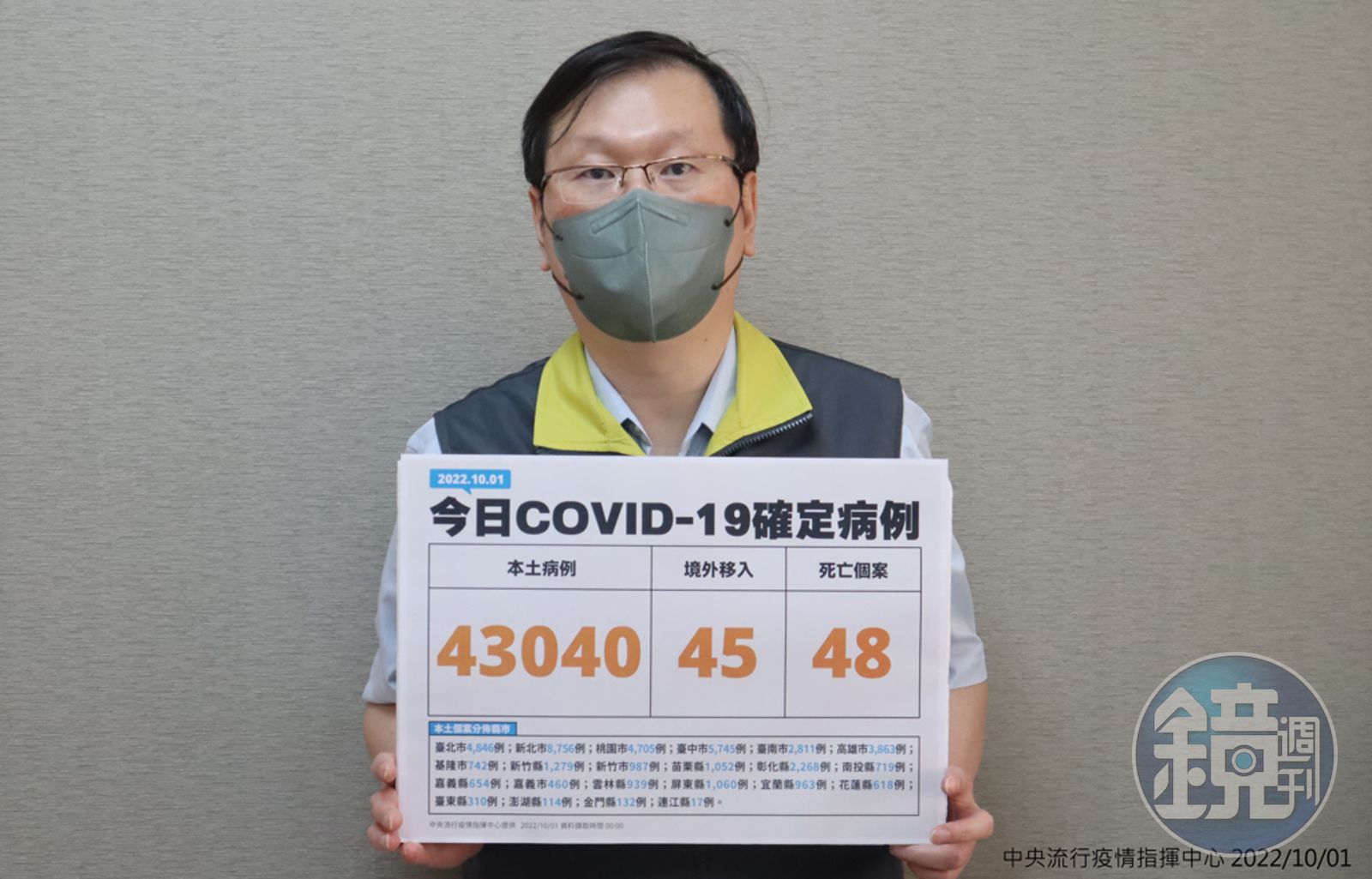 指揮中心提到,今天新增48例本土病例死亡個案,為32例男性、16例女性,年齡介於40多歲至90多歲以上,皆屬重度感染、44例具慢性病史、30例未接種3劑以上COVID-19疫苗。確診日介於今年5月14日至9月28日,死亡日期介於5月14日至9月28日。境外移入的部分,今天新增45例個案中,為23例男性、22例女性,年齡介於10多歲至60多歲,分別自法國、香港及德國(各1例),另42例感染國家調查中。入境日期介於今年9月1日至9月30日。