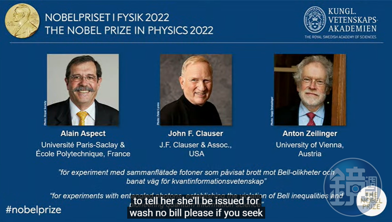 諾貝爾物理獎揭曉!法、美、奧3學者研究「量子力學」共享殊榮。(翻自諾貝爾官方YT)發布時間:2022.10.04 17:56 臺北時間