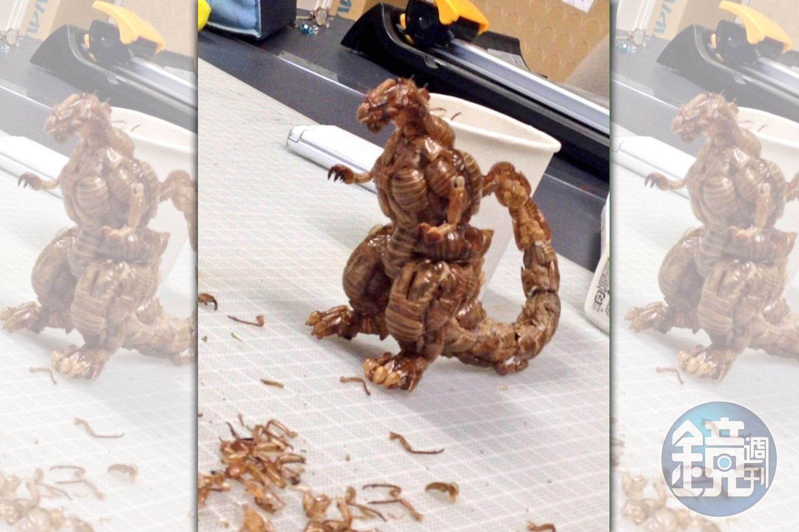 該網友3日在臉書社團「爆廢公社公開版」PO文,霸氣寫下「保證連女朋友、老婆都不敢碰的蟬哥吉拉!」並附上一隻由數個棕色蟬殼所組合而成的哥吉拉照片,模樣雖然不輸市售公仔,但能夠清楚看出蟬身上的構造及紋路,第一眼可能會誤以為是收集蟑螂屍體拼湊而成。