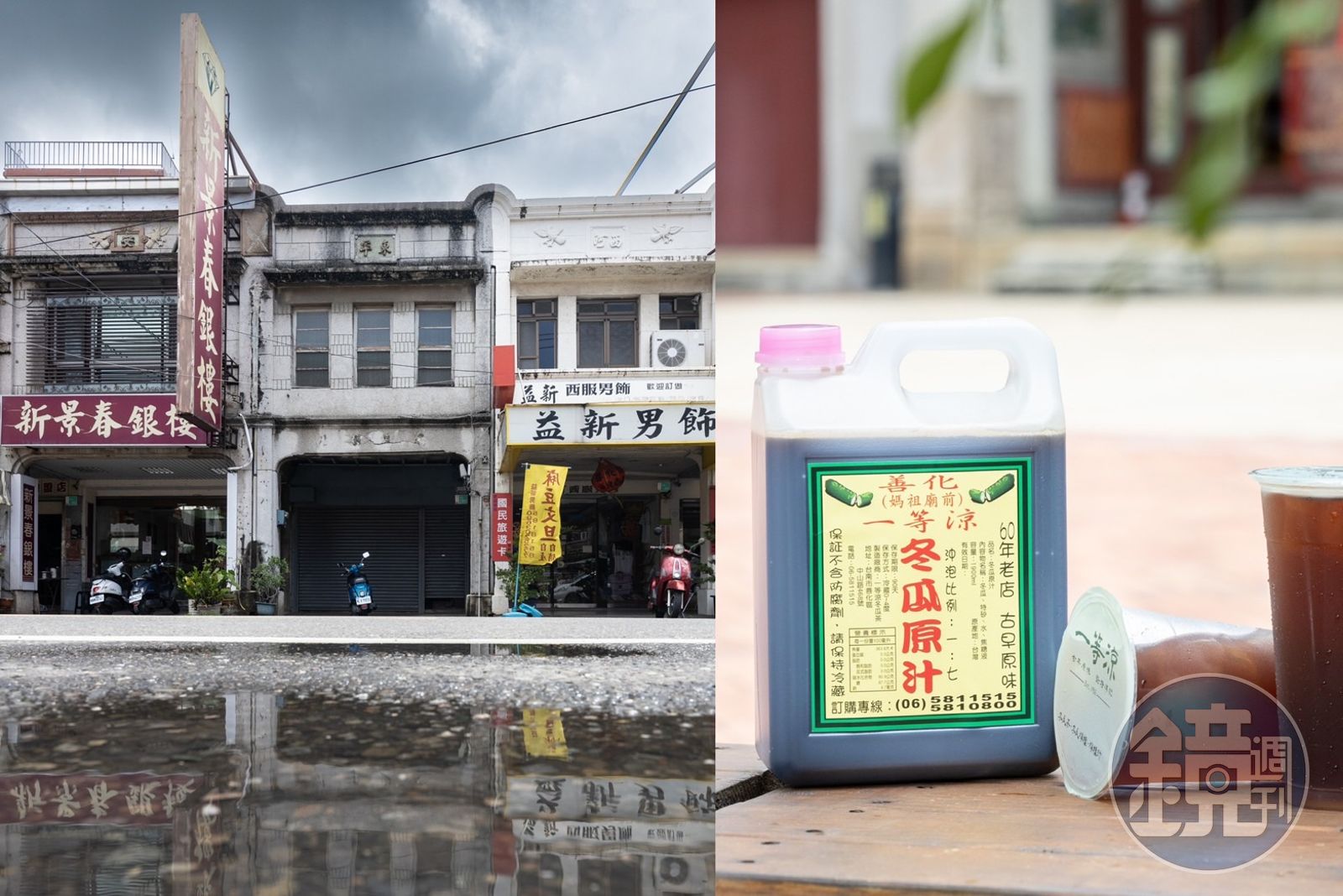 轉角處還有自1956年開業至今的「一等涼冬瓜原汁」,這裡的「冬瓜茶」和「冬瓜檸檬茶」各有死忠擁護者。店家挑選成熟的大冬瓜削皮切塊,與特砂熬煮成冬瓜露後,再加水煮成冬瓜茶。冬瓜檸檬茶則選用屏東九如檸檬,老闆和員工每日清晨四點就進工廠忙著煮茶、榨檸檬,讓大家能夠捧著一杯杯帶著果香的甜蜜沁涼,感受古早味小確幸。