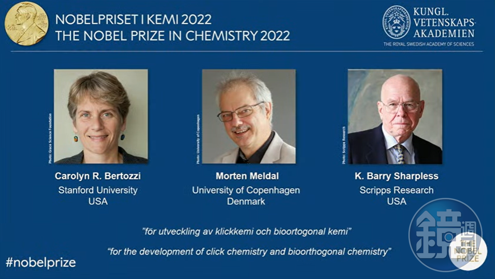 2022年諾貝爾化學獎在今日台灣時間下午5時45分揭曉,由美國與丹麥3名學者共享殊榮。得獎者分別為美國學者貝托琪(Carolyn Bertozzi)、丹麥學者梅爾達(Morten Meldal)、美國學者夏普勒斯(K. Barry Sharpless)。大會指出,3人在鍵擊化學(Click Chemistry)及生物正交化學(Bioorthogonal chemistry)的研究發展有所貢獻。