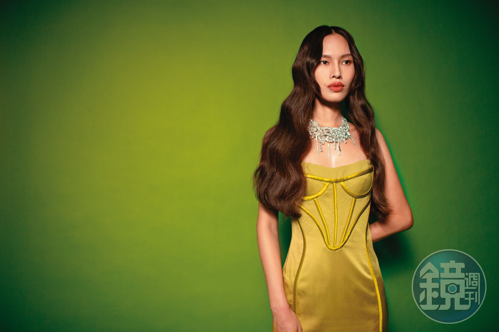 橄欖綠色馬甲禮服,NT$314,500,by VERSACE;金屬項鍊,NT$1,499,by H&M。發布時間:2022.10.14 05:58 臺北時間