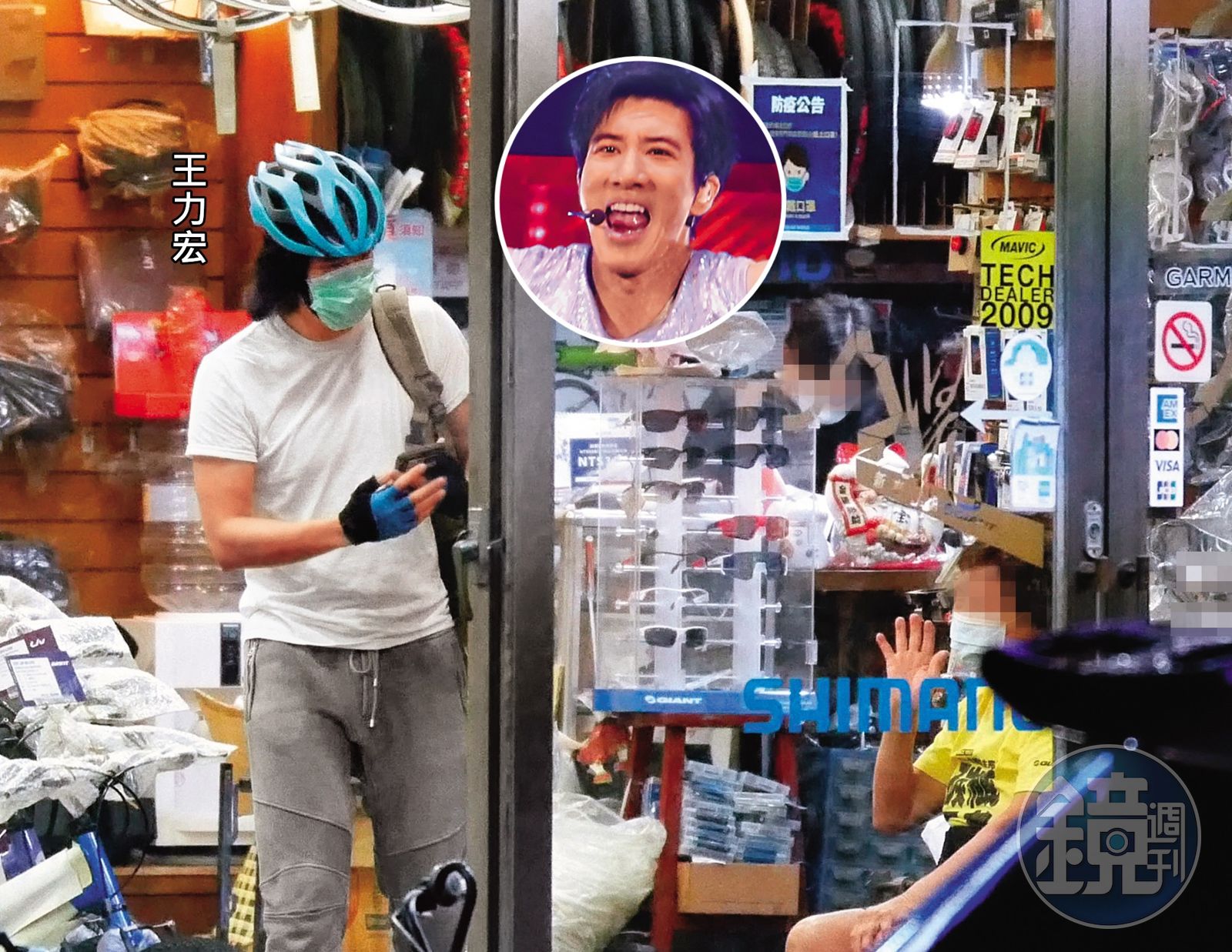 本刊循線調查,終於在10月5日晚間7點半,發現王力宏騎著腳踏車出門,然後戴著安全帽、口罩且留有長髮的他,還揹一個大後背包,同樣在腳踏車店內閒晃;只見他忽然從身後拿出一把隨身捲尺,丈量一輛兒童腳踏車的高度,看來是有備而來。