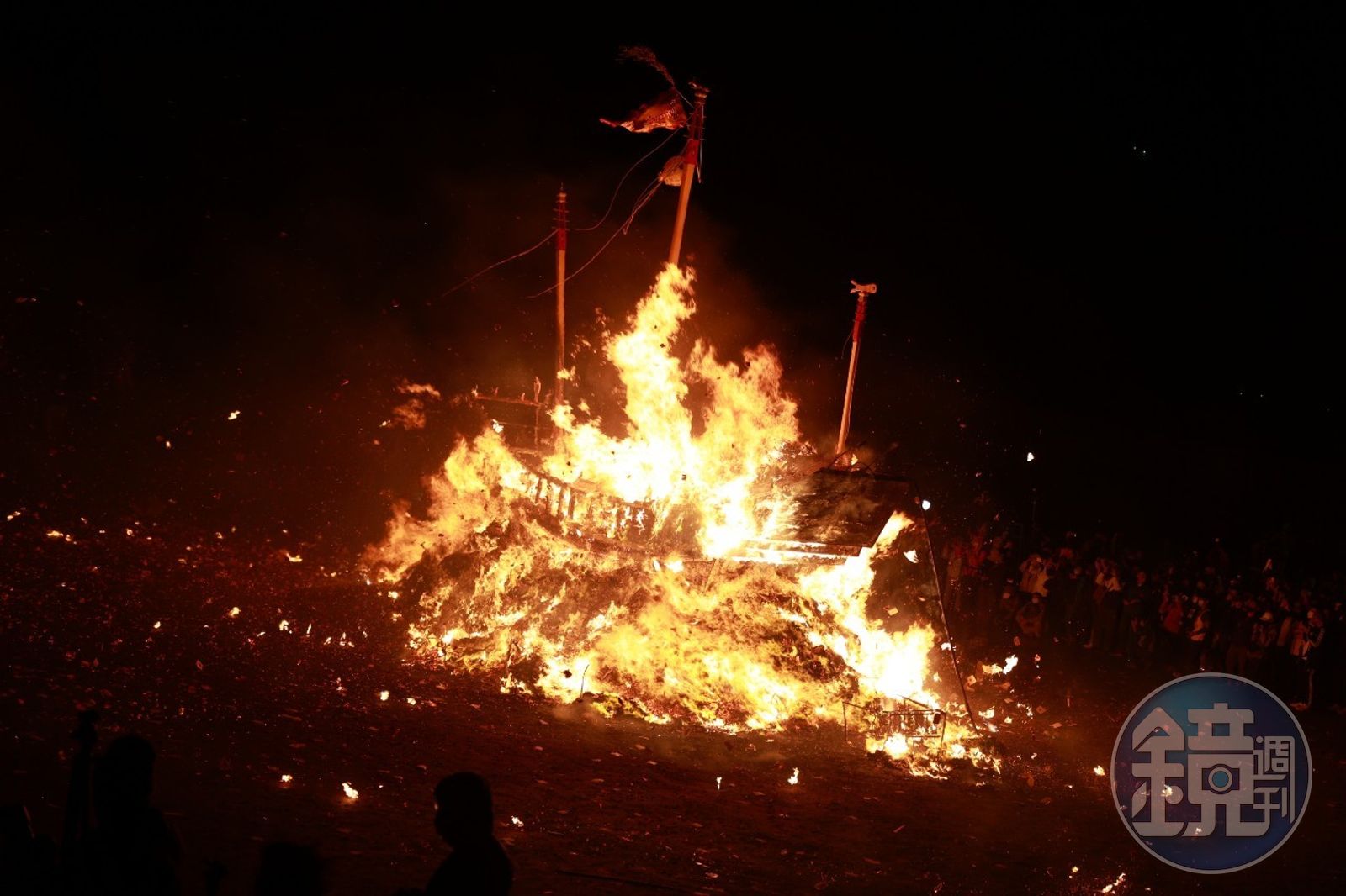 時辰一到,罕見停放3年的白沙屯五雲宮王船「順安陸號」揚起船帆,伴隨震耳欲聾的鞭炮與沖天的火光,終於化作灰燼遊向天河。