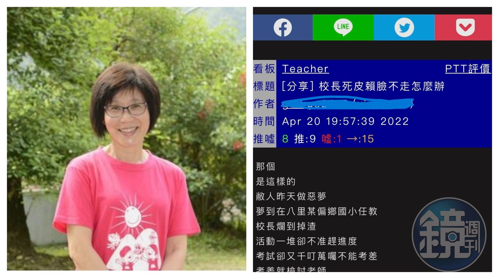 本刊調查,新北市八里區長坑國小校長黃淑華接連被爆料,假公濟私惡整學校老師,還因為PTT上一則「校長死皮賴臉不走怎麼辦」PO文,認定是學校張姓老師造謠毀謗,故提告張涉妨害名譽、加重毀謗罪,蘆洲警方查出PO文者是學校1名女老師的曾姓男友,校長不相信,現今檢方查出確實是曾男,不是張老師,1名教育局官員表示,黃校長如何善後,正考驗她的智慧!