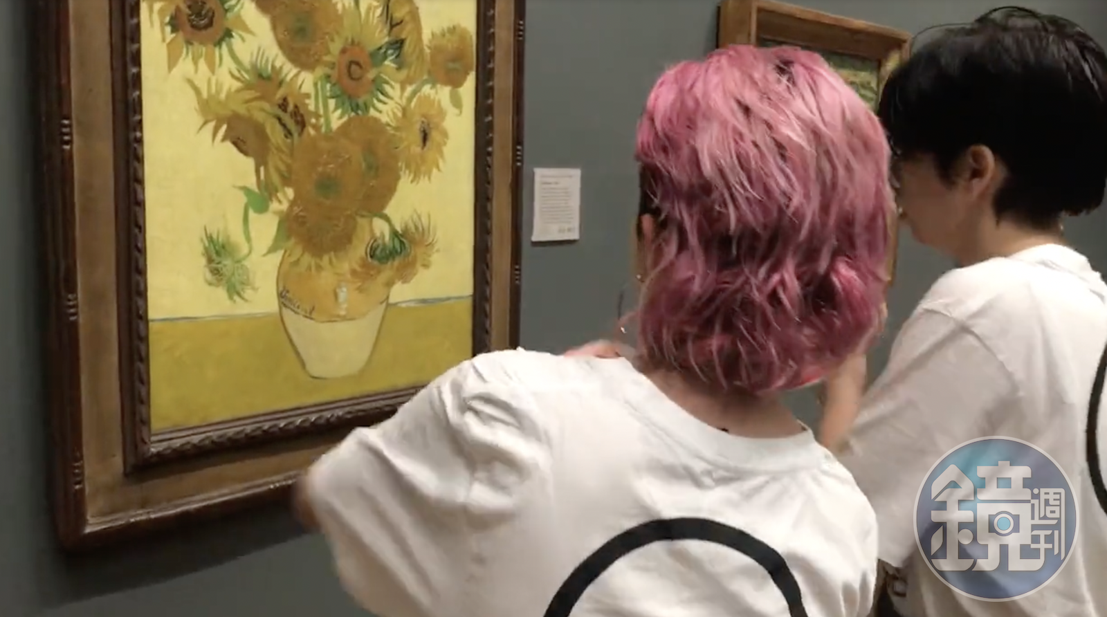 綜合外媒報導,這幅《向日葵》(Sunflowers)在英國倫敦國家美術館(National Gallery)公開展出,但卻來了2名身穿白衣的環保人士,為表達要求不要再開採新的石油和天然氣,竟朝畫作潑撒罐頭番茄汁,再把沾雙手沾滿膠水,黏在牆壁上。
