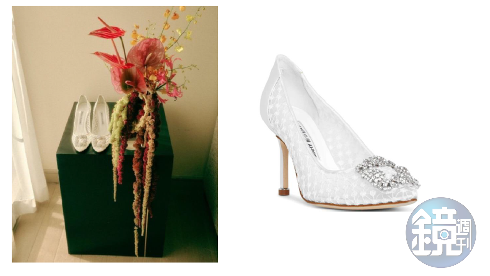 (左)孔曉振在IG上連發結婚的照片,可以感受到歐膩的雀躍,而在捧花旁的就是MANOLO BLAHNIK經典的Hangisi。(右)白色圓點蕾絲Hangisi高跟鞋 NT$46,800 MANOLO BLAHNIK。(MANOLO BLAHNIK提供)發布時間:2022.10.19 17:15 臺北時間
