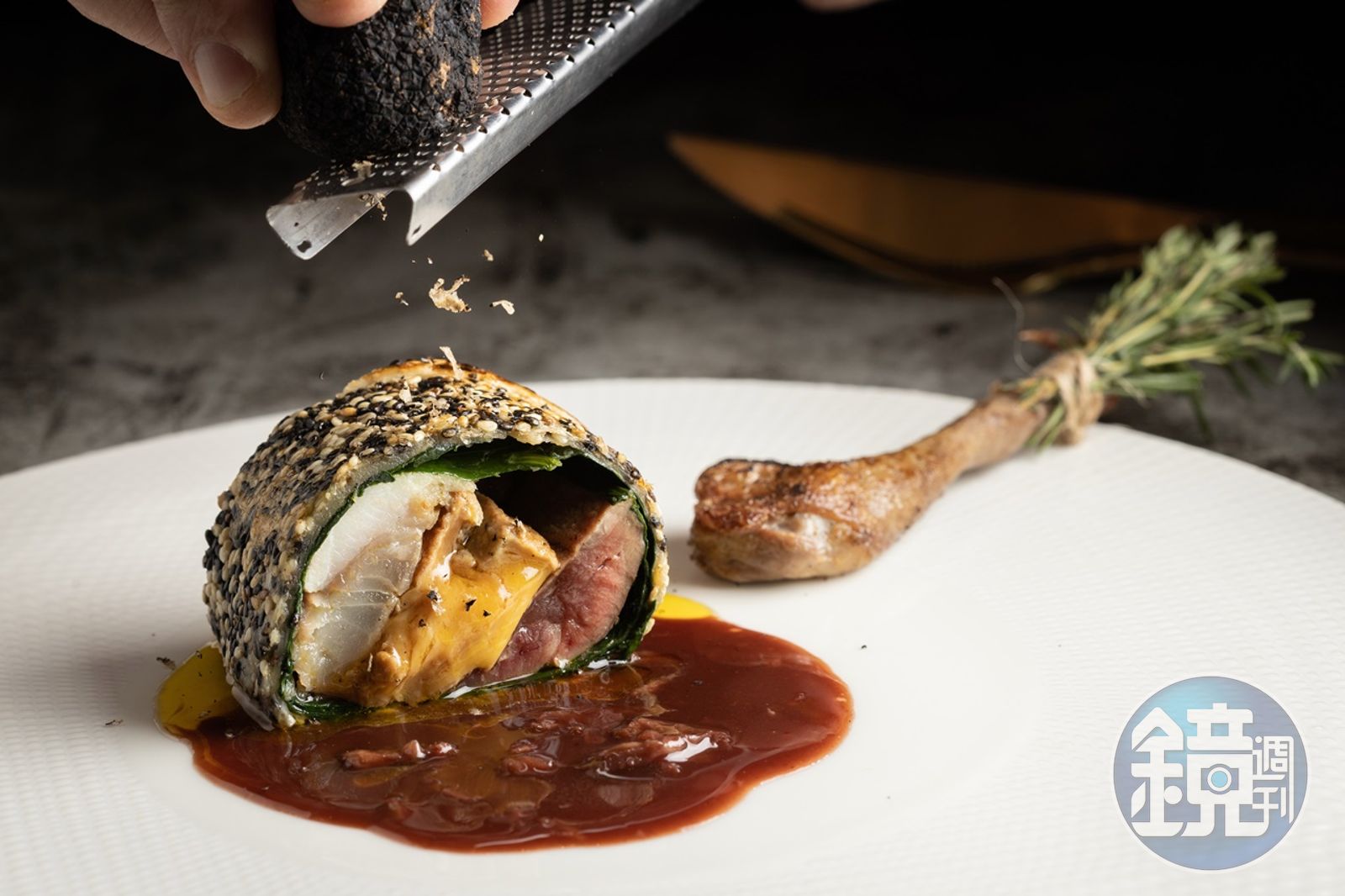 「醃冬菜、胭脂乳鴿、龍虎斑、鴨肝、黑松露」酥皮捲入乳鴿、龍虎斑和綿潤鴨肝,油脂互補協調,洗過的醃冬菜與乳鴿骨、波特酒煮成醬汁。日本和牛菲力裹上昆布、荷葉,再敷上酒店認養的台南北門井仔腳的鹽做成「黑蒜頭、日本和牛菲力、孢子甘藍、薯皮粉、成功鹽」的黑蒜頭醬汁,醬香深邃。
