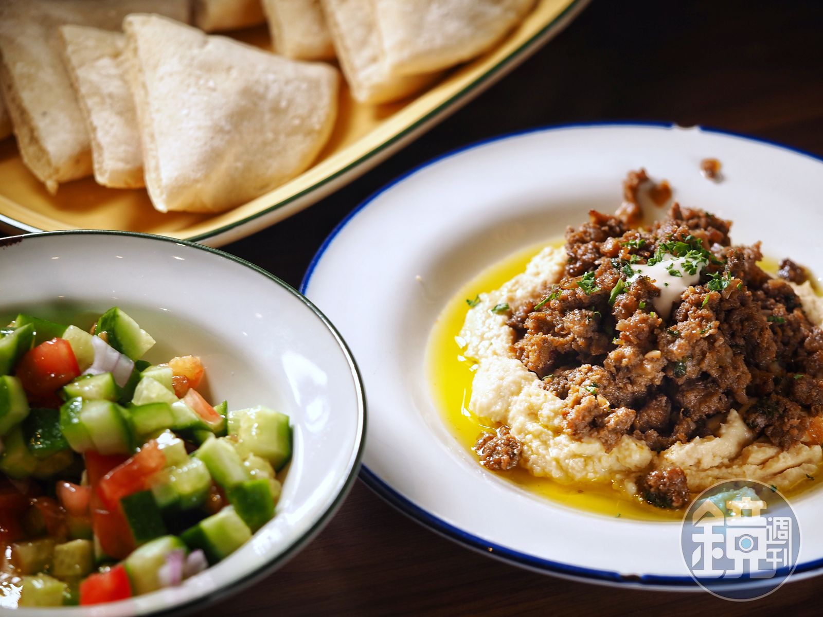 來到這裡,必吃的是各種以鷹嘴豆泥為底的料理,原產自中亞的鷹嘴豆,因為長得像鷹喙得名,台灣也有引進,就是刨冰店裡的雪蓮子。因為鷹嘴豆具有豐富的植物蛋白、礦物質和膳食纖維,且含有8種必需胺基酸,成為了地中海、中東、印度等地人們的重要食物,近來流行的Vegan族群也視它為寶,豆皮、豆仁、煮豆水都有妙用。