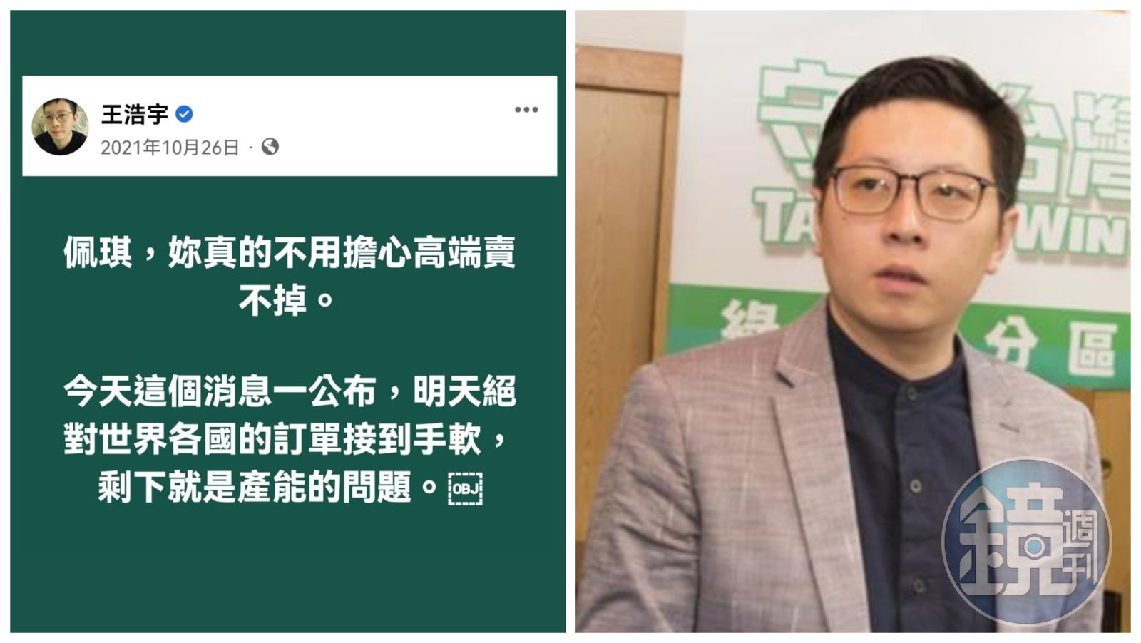 不少網友挖出王浩宇去年的言論調侃,當時他抨擊台北市長柯文哲的夫人陳佩琪認為高端疫苗浪費錢的看法。王浩宇昔日寫道:「佩琪,妳真的不用擔心高端賣不掉。今天這個消息一公布(指WHO當時公告的團結試驗疫苗聲明),明天絕對世界各國的訂單接到手軟,剩下就是產能的問題。」