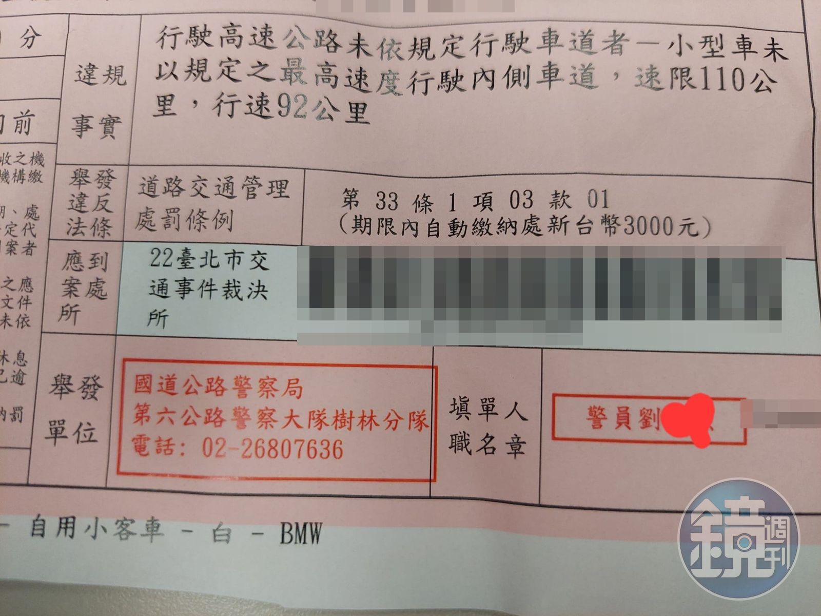 根據罰單上寫的違規事實:「行駛高速公路未依規定行駛車道者-小型車未以規定之最高速度行駛內側車道,速限110公里,行速92公里」,違反道路交通管理處罰條例,開罰3,000元。