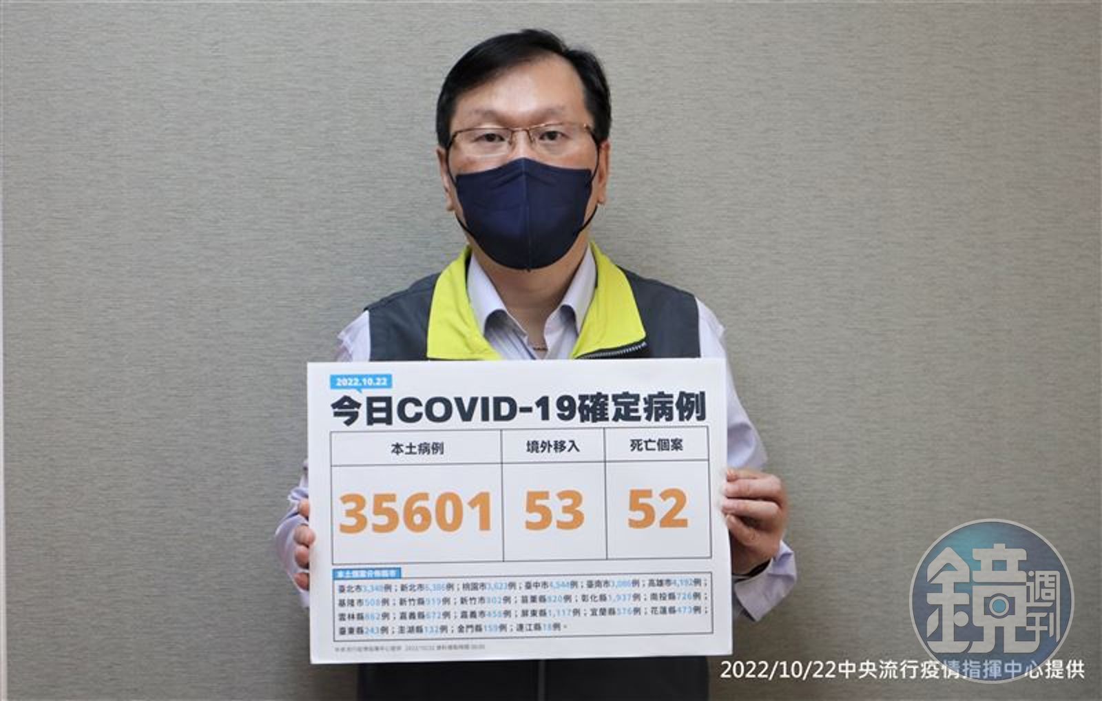 而今天新增52例本土病例死亡個案中,有33例男性、19例女性,年齡介於20多歲至90多歲以上,皆屬重度感染、46例具慢性病史、35例未接種3劑以上COVID-19疫苗。確診日介於今年9月7日至10月19日,死亡日期介於10月10日至10月19日。