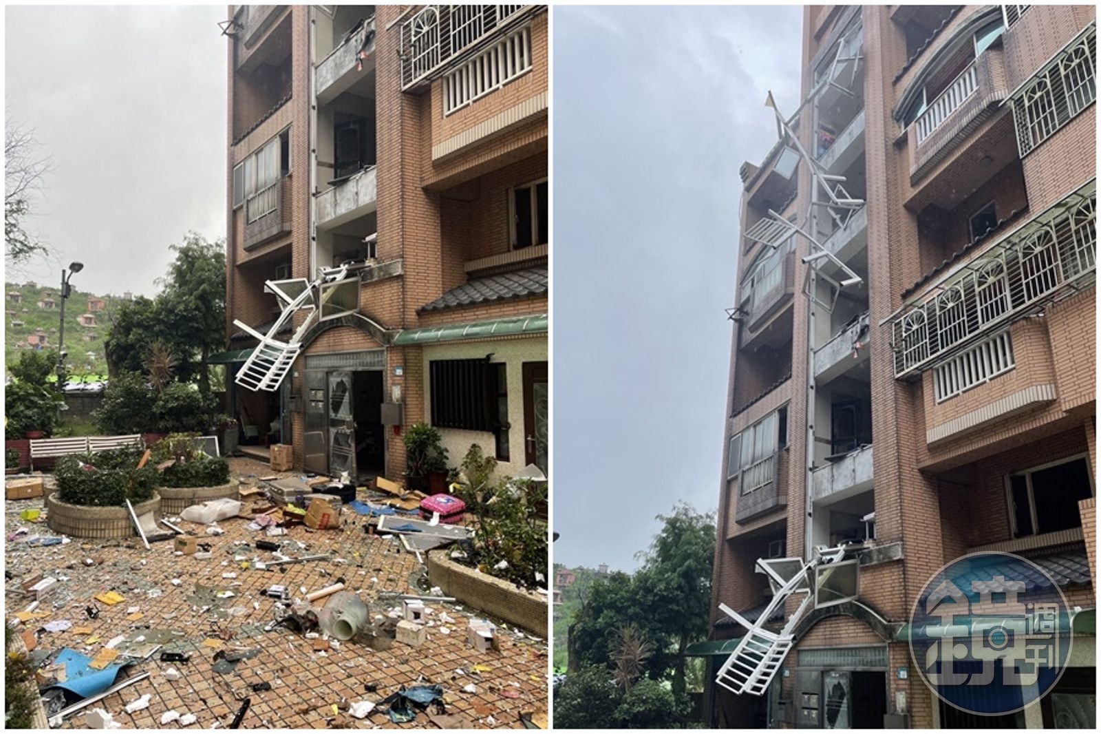 據了解,屋內一名20多歲男子全身燒燙傷,送往亞東醫院急救,目前共2男3女受傷送醫,詳細氣爆原因仍待釐清。 而現場爆炸畫面也跟著曝光,可見大樓中庭散落氣爆後,噴飛的碎玻璃與行李箱等物品,連民宅玻璃、遮陽雨棚、窗架也被波及震到碎裂。