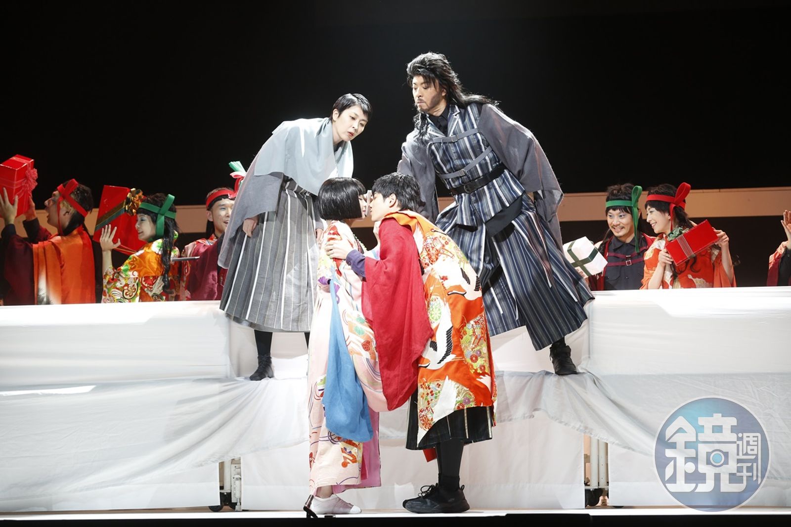《Q:歌舞伎之夜》以英國Queen皇后合唱團專輯《歌劇之夜》為創作靈感,將源賴朝和平清盛之爭呼應《羅密歐與茱麗葉》中凱普萊特和蒙太古的故事。今天為媒體呈現的兩段,主要是松隆子和上川隆也「回顧」兩人年輕時的片段,只見年輕版志尊淳與廣瀨鈴互許心意,就在四片嘴唇即將貼合時,上川隆也和松隆子「剛好」拿出信紙擋在兩人中間,志尊淳還微微笑場,非常可愛。