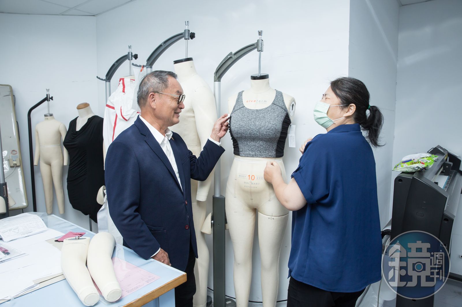 例如我們跟著林瑞岳巡視樣品室,只要是男性員工,他都尊稱師傅,女性員工,他一概說是妹妹,沒有老闆距離感。提到3年前疫情剛爆發、口罩大缺貨時,他從墨西哥拿了2萬盒到台灣公司發放,1人1盒,「那時候同仁看到我就抱住我,那是做董事長最光榮的時候。」