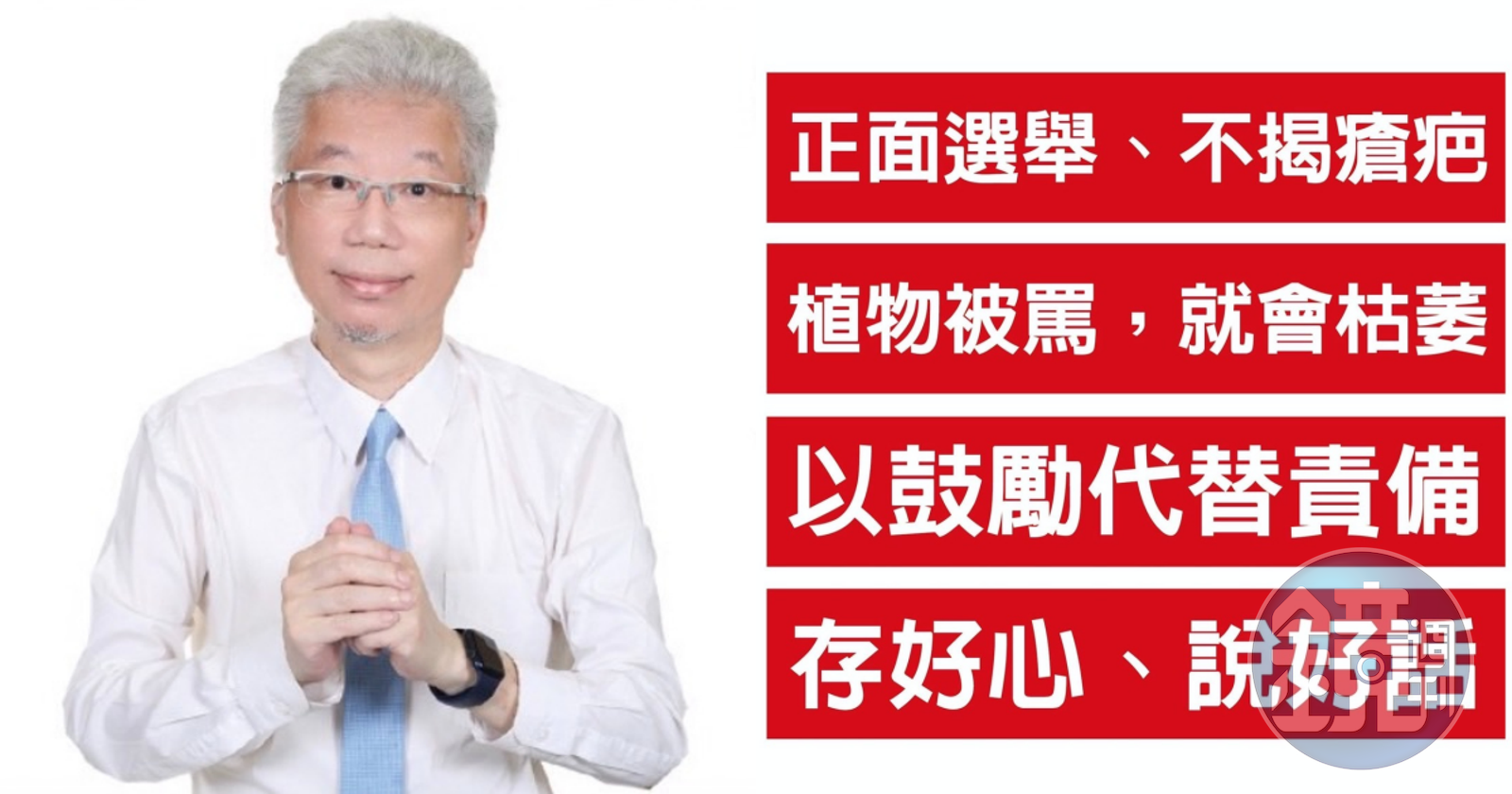 李光輝表示,這次選舉充滿了太多酸言酸語,他不禁想問,揭露人的瘡疤,如誰的論文抄襲、造假,這跟施政能力能呈正相關嗎?他認為候選人應該互相講好話,讚美對手政見的優點,選舉就會祥和,媒體也會報導,間接也能拉抬候選人的聲勢。他指出,希特勒是好學生,卻挑起世界大戰;邱吉爾抽菸、喝酒生活習慣不佳,卻拯救了英國。可惜目前媒體版面都是「負面消息」,已經擠壓好政見討論實現的機會了!