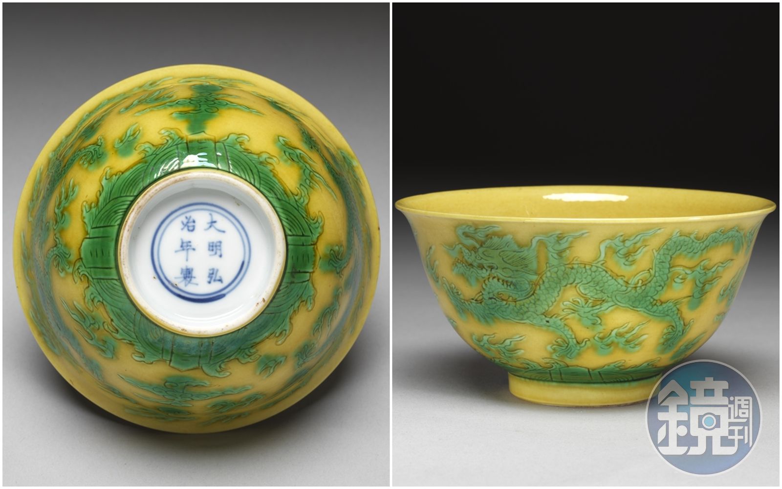 根據故宮網站顯示,「嬌黃釉綠彩龍紋碗」類別陶瓷器,功能是盛裝器,說明文寫道「均侈口窄唇,深壁,矮圈足。外面彫刻雙龍戲珠,隙地加飾朵雲,底邊飾波濤紋,內面樸素無紋飾。薄胎骨,嬌黃釉,花紋加填綠彩。底均有青花書『大明弘治年製』六楷字款,外加雙圈。」