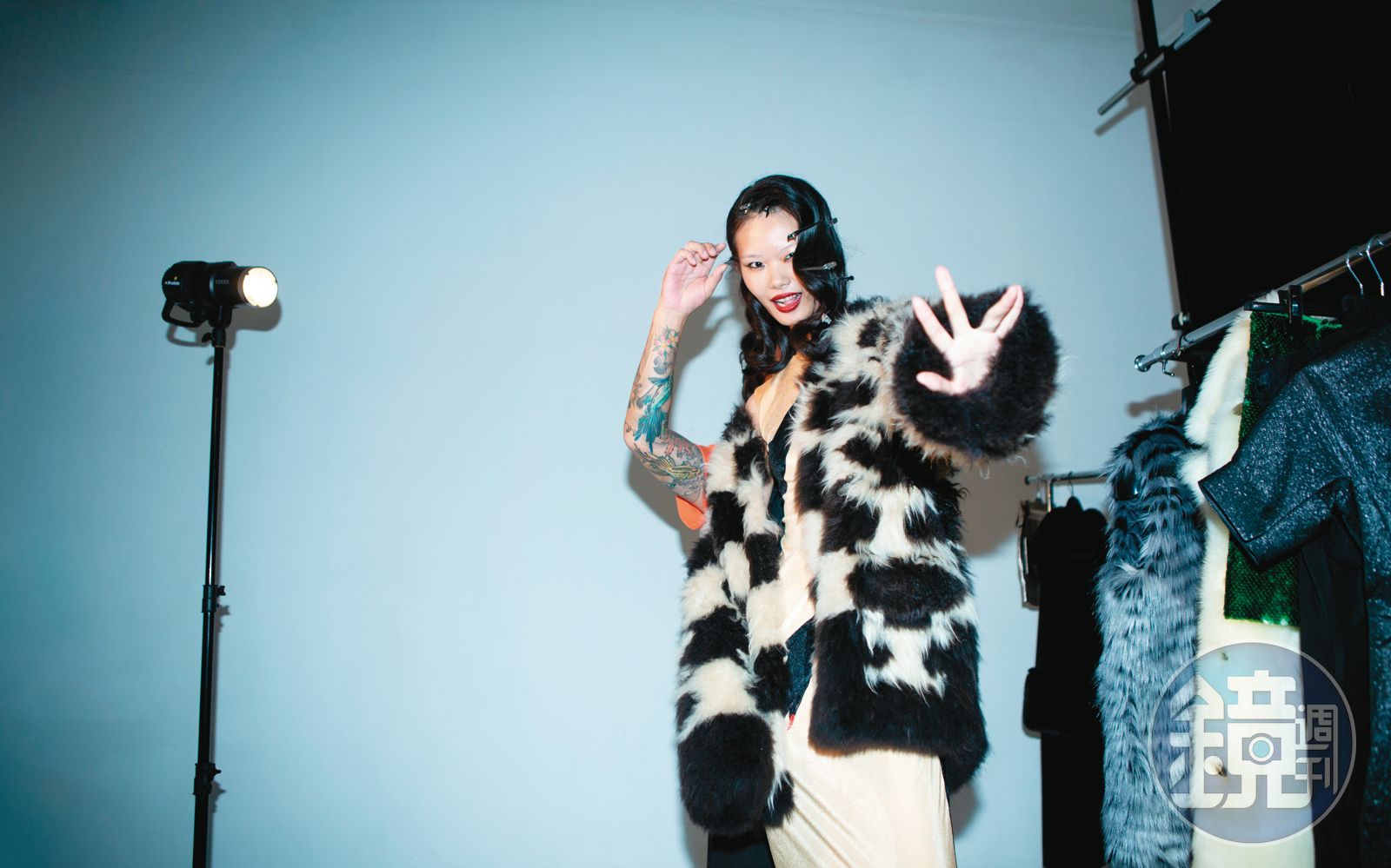 再搭撞色內搭,跟著鴕鳥毛一同搖曳生姿。