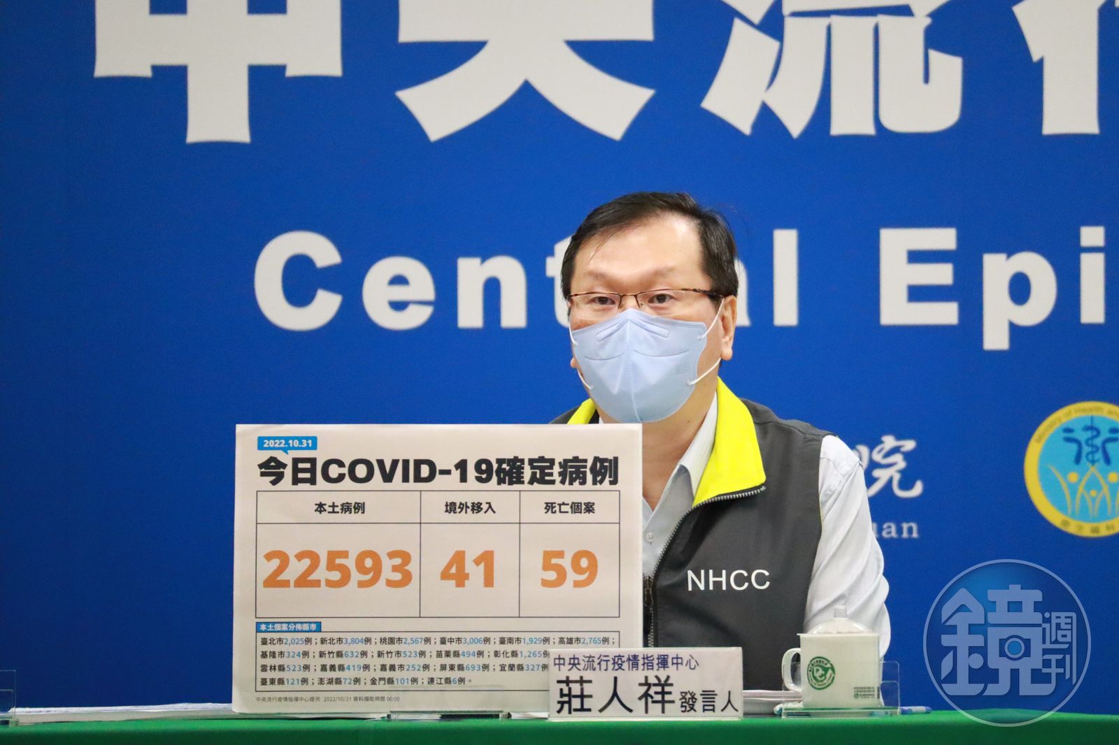 醫療應變組副組長羅一鈞指出,新增127例中症、44例重症,今日並無兒童、青少年中重症或病歿案例;病歿個案方面,羅一鈞說明,1名有糖尿病、高血壓等慢性病史,未打疫苗的40多歲男性,10月21日出現呼吸道症狀,快篩陽就醫,診所診斷為新冠病毒感染及急性氣管炎,通報並進行居家照護,隔日在家中昏迷死亡,之後行政相驗開立死亡診斷書,死因為新冠肺炎併心肺衰竭。