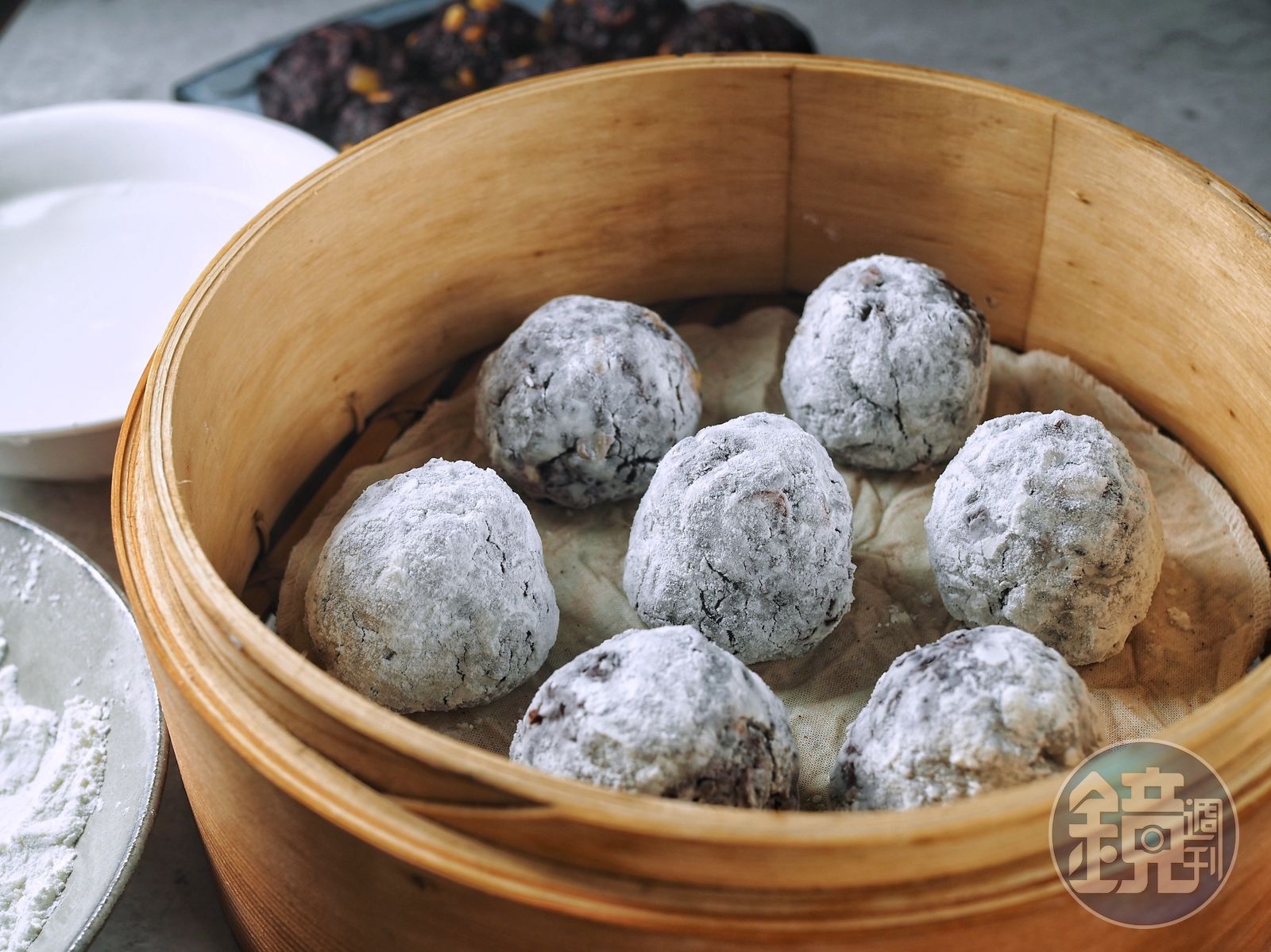 - 另外在盤中倒一些糯米粉,捏好的球團先沾一層糯米粉,沾一次水,再沾一次糯米粉,排入鋪好濕布的蒸籠裡。