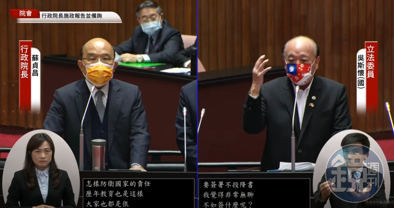 國民黨立委吳斯懷在立法院質詢時,他認為簽署不投降同意書「非常無聊」,不如簽署中共犯台時「絕不離開、死守台灣」。(翻攝自國會頻道YouTube)發布時間:2022.11.01 14:30 臺北時間