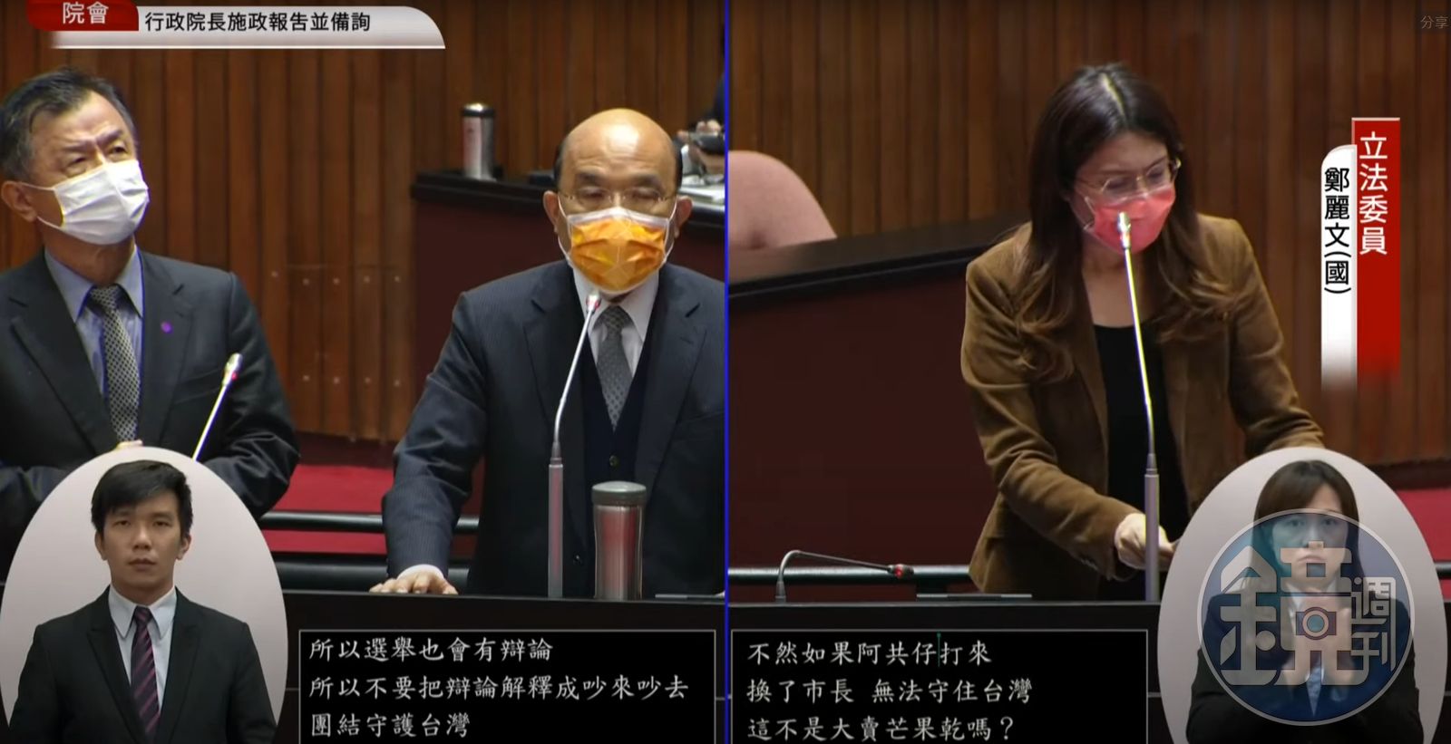 鄭麗文並未回應蘇貞昌,反而開始緊咬鄭運鵬去中國經商時,申請專利文件上出現國籍「中國台北」的事件,「這還不嚴重嗎?」蘇則回應提到,申請國際專利的表格就是如此,民眾黨新竹市長參選人高虹安也是這樣,鄭向蘇疑惑表示,「高虹安不是我推薦的,你跟我講她幹什麼?」不過最終2人質詢時間結束,這段話題就突然終止了。