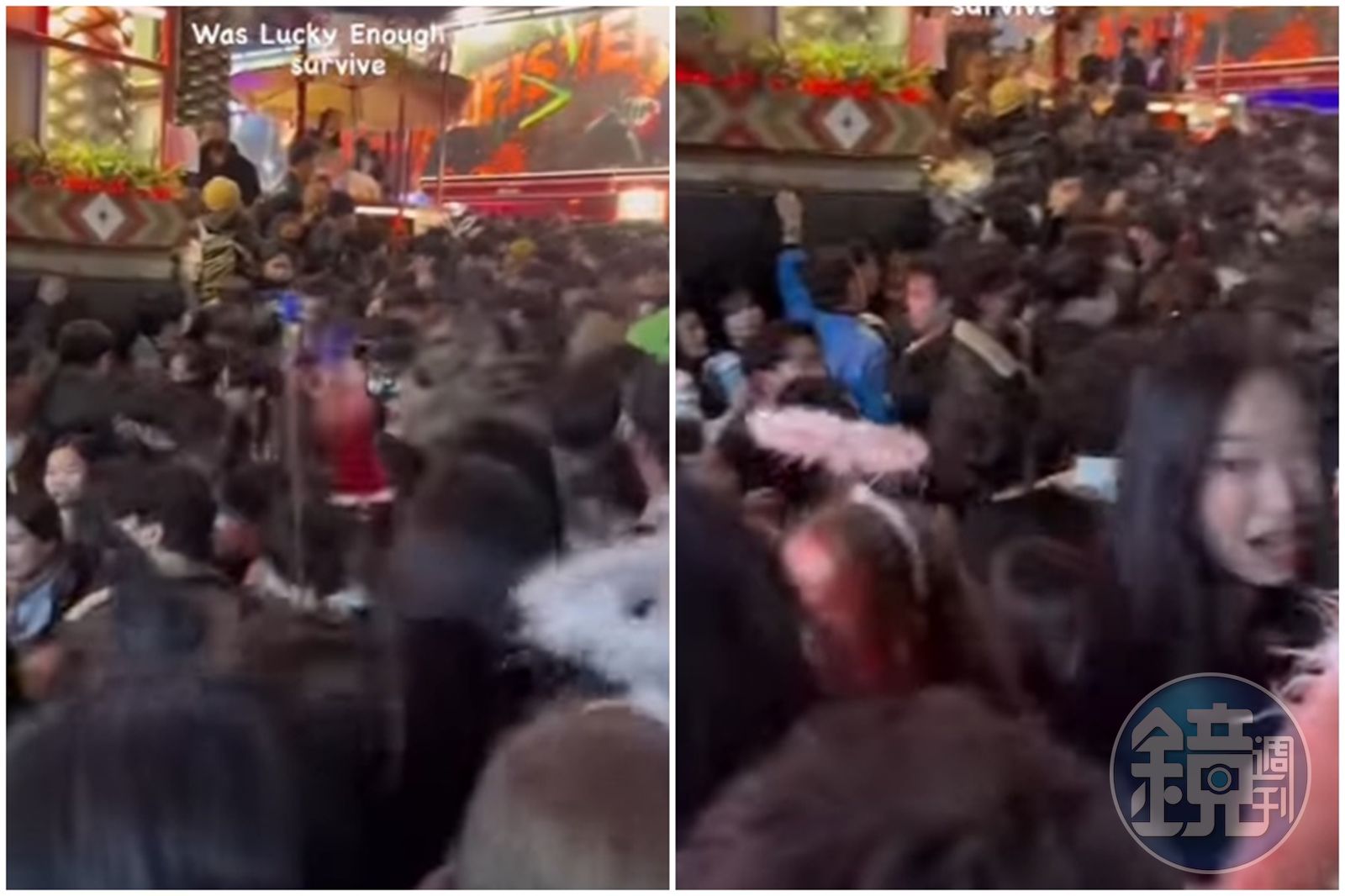 一名網友在PTT上以「疑似韓國梨泰院事件最一開始發生時片段」標題發文,影片中可以看到大票人密集慢速行進中,突然上方的人往下推擠,不少人被突如其來的用力推擠紛紛轉頭看,其中還不少人舉起手比著「往下」的手勢,示意要大家往前走動,「但因一方的作用力造成人們開始進入卡死狀態,再一波的作用力,造成人們就像罐中牙籤般動彈不得,側邊幸運的人快速往旁邊爬上高處」,不過中間的人只能任憑人群推擠,持續被往下用力推擠,可以看到不少人臉部開始扭曲。